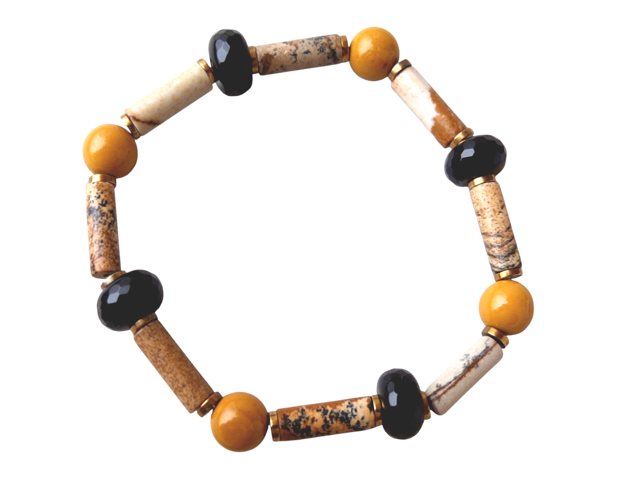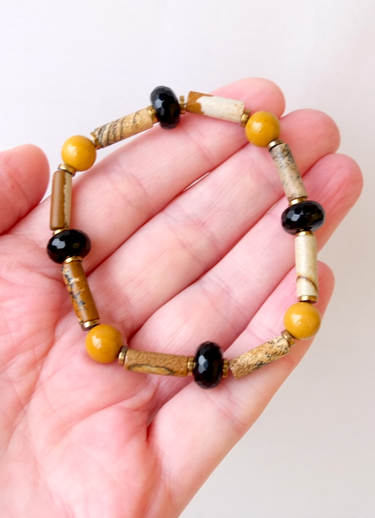 Браслет из песчаной яшмы (в среднем 5*14 мм), гранёного агата (10 мм) и керамики (8,5 мм, имитация по цвету яшмы мукаита).