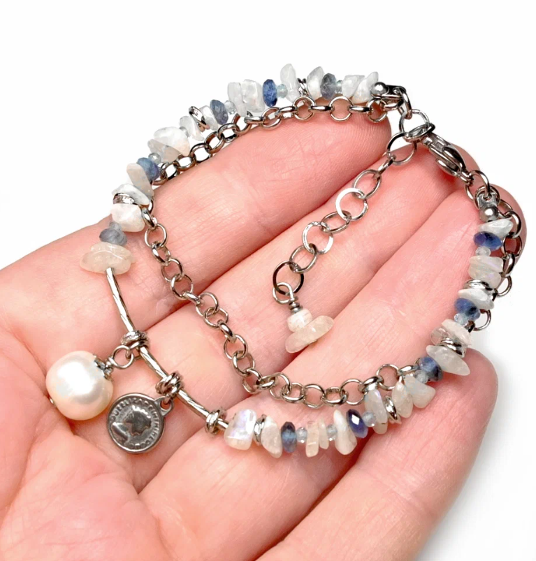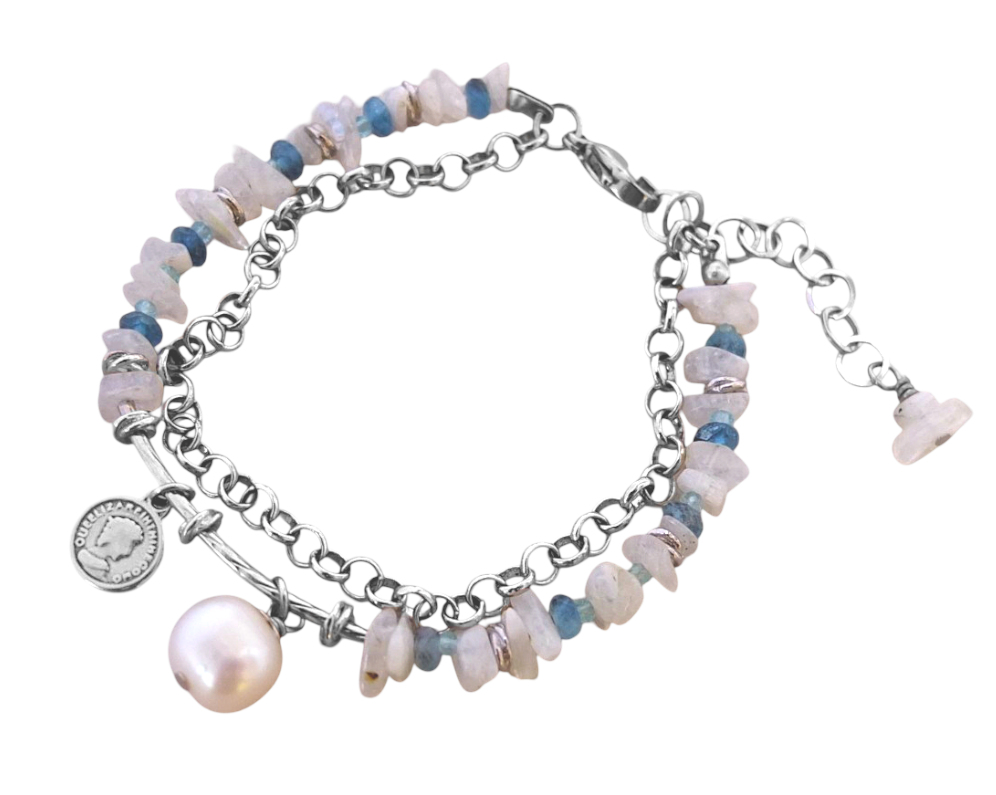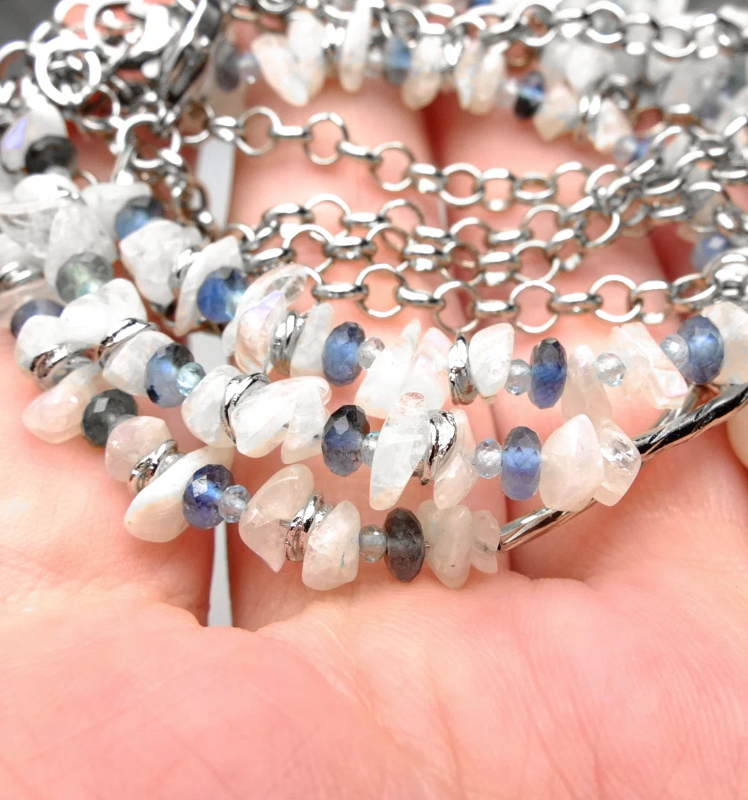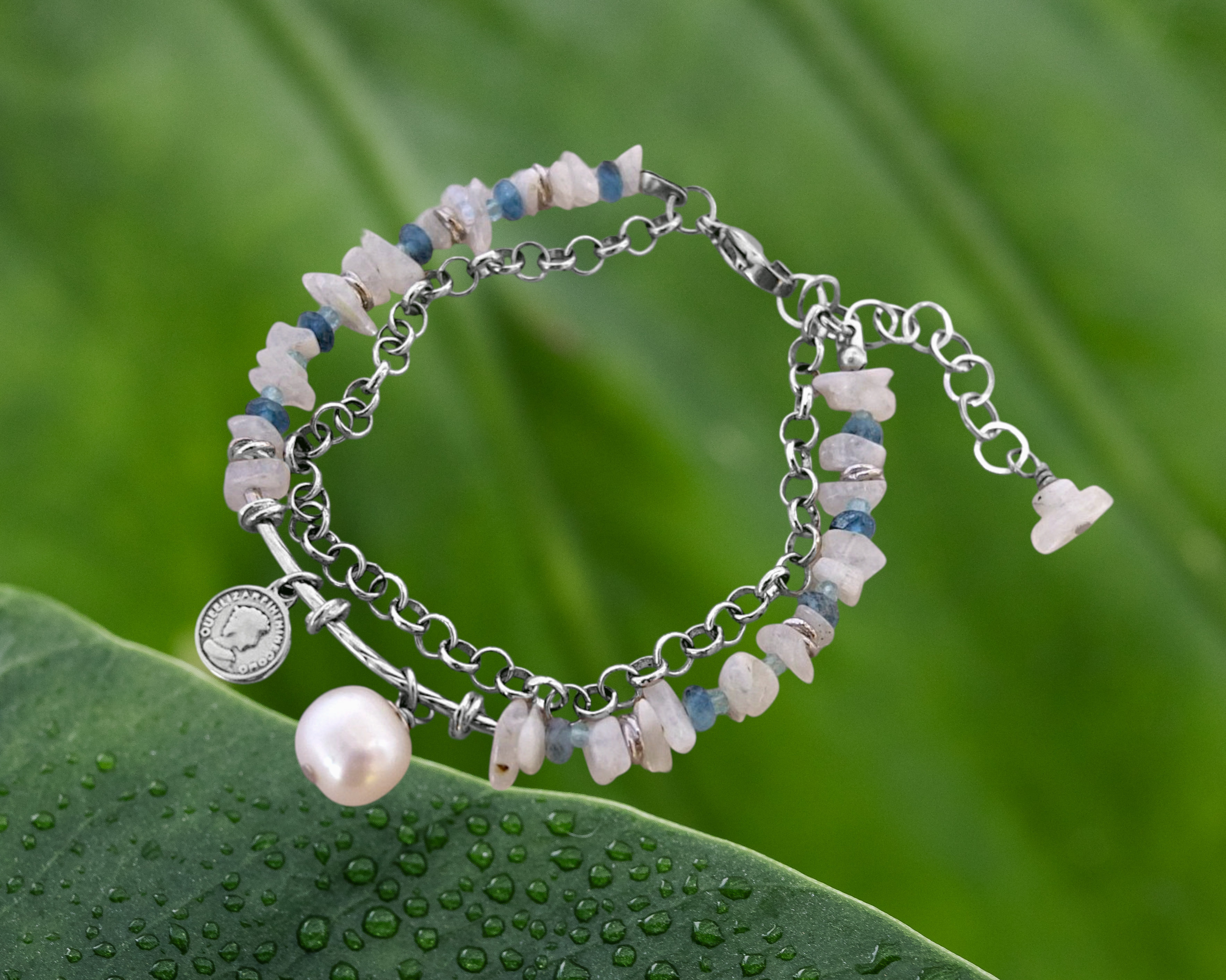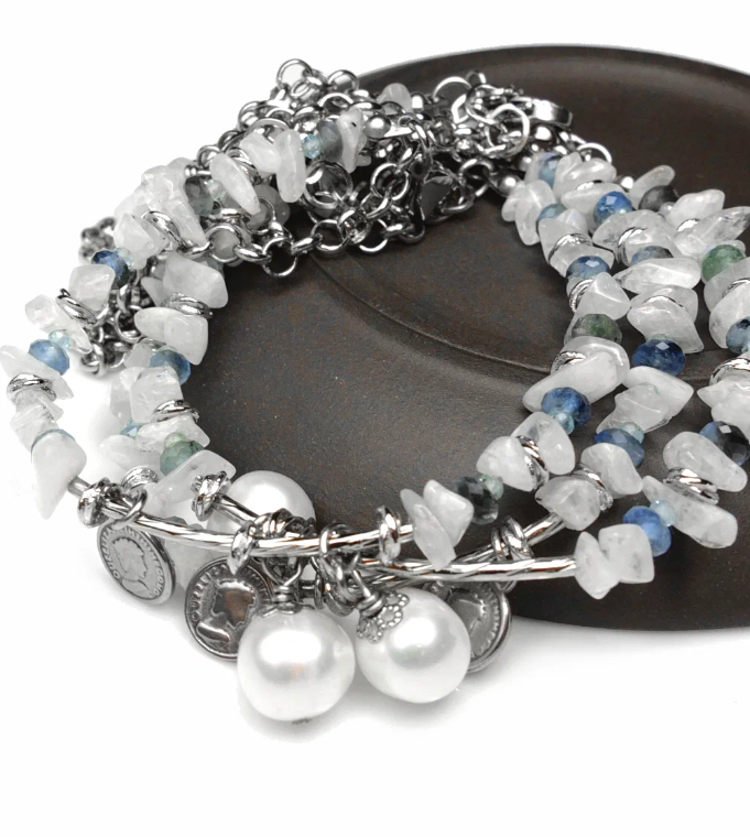 Браслет в бело-голубой гамме. Гармоничная композиция из лунного камня (адуляра), аквамарина с интригующими вкраплениями черного турмалина и нежного аква-апатита создает неповторимую игру света.