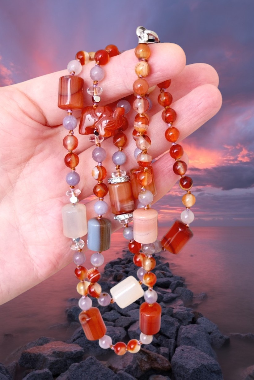 Красноватый агат и сардоникс, словно специи на прилавке — яркие, терракотовые, теплые. Эти камни дарят жизненную силу и уверенность. Их иногда называют "камнями заката" за их глубокий, успокаивающий красный оттенок.