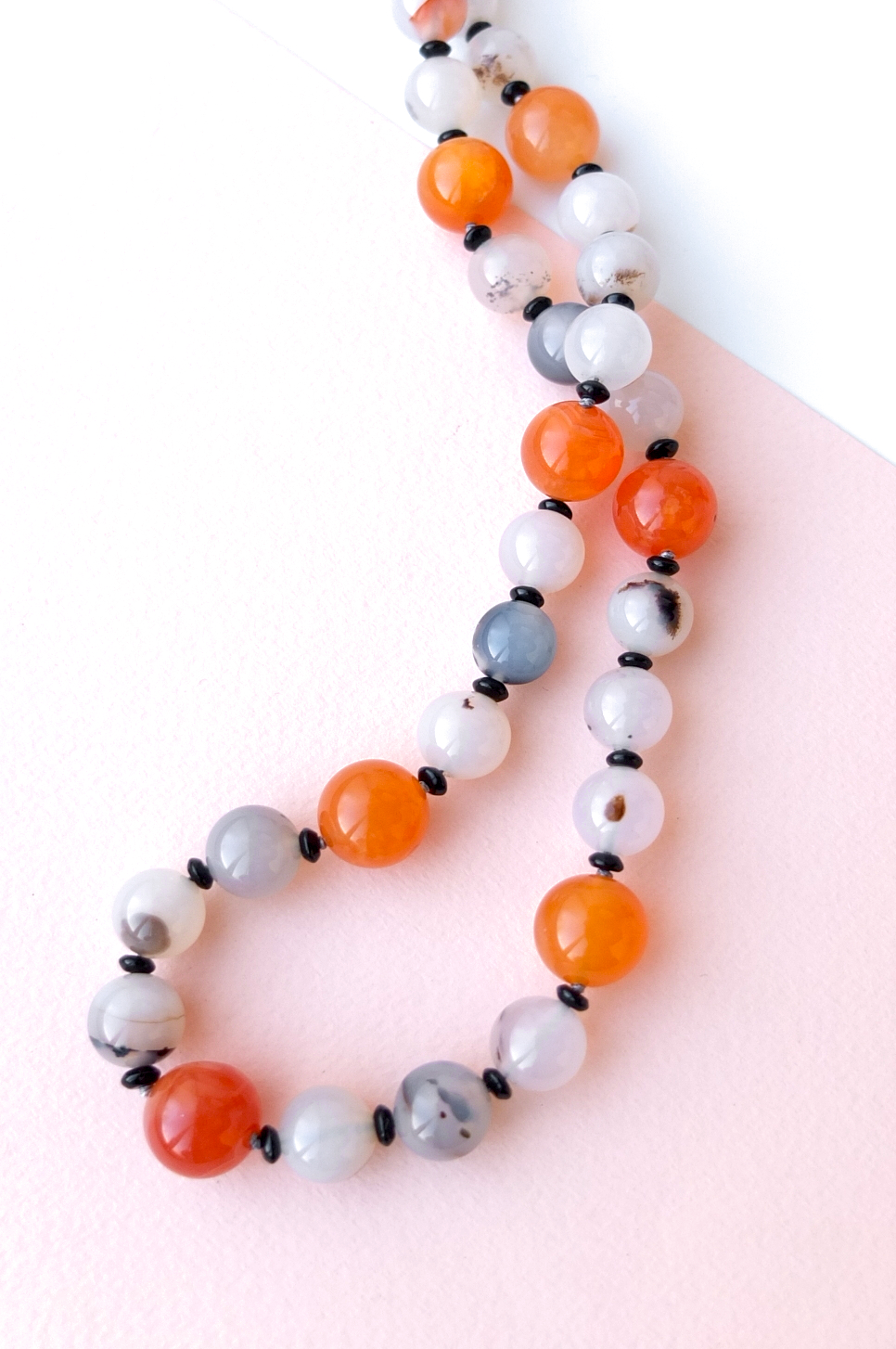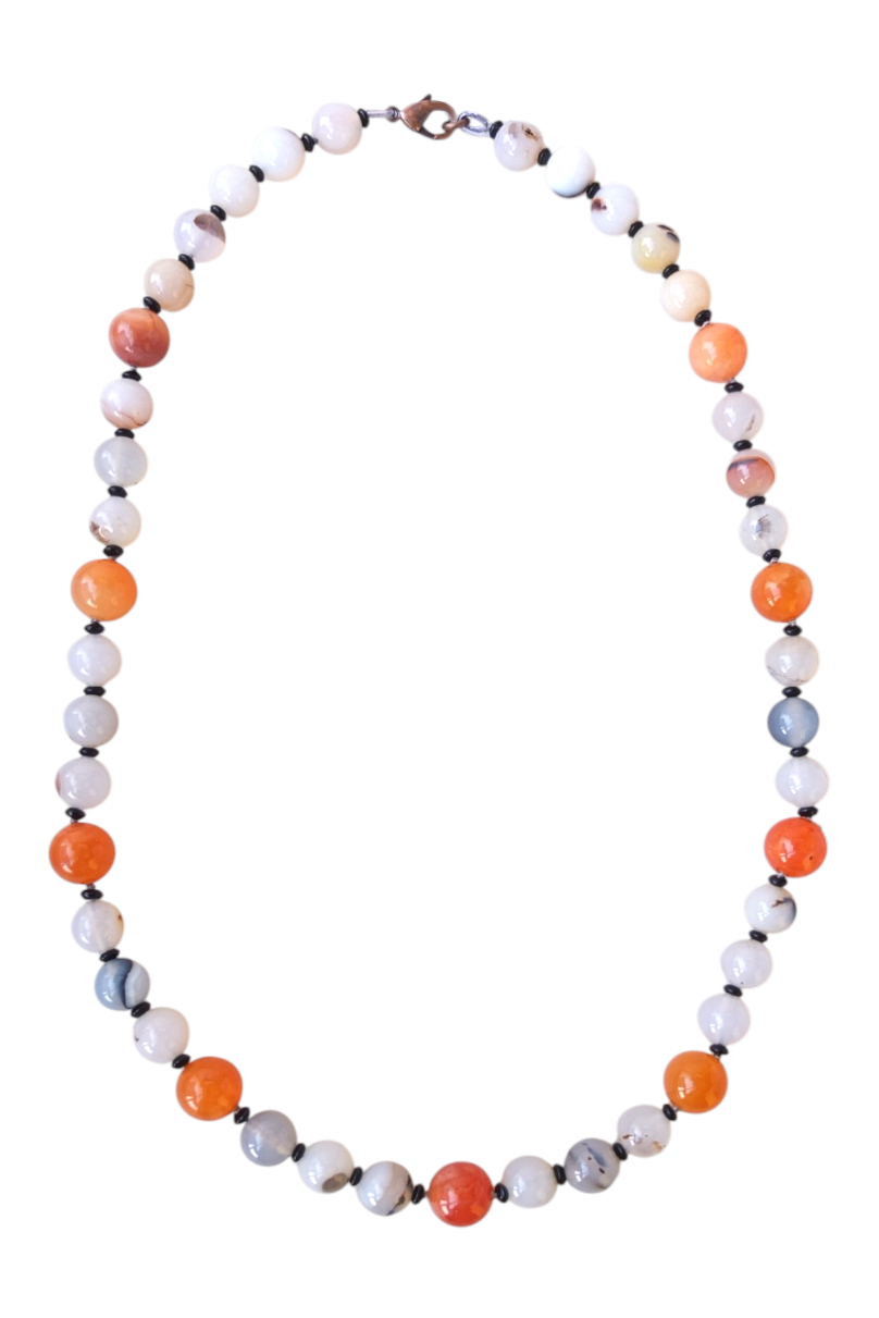 Природный рисунок серого агата можно взять за основу - он подходит всем! Каким бы цветом волос не одарила вас природа, в сочетании с агатом образ преображается, даря свою особенную прелесть блондинкам и брюнеткам, шатенкам и рыженьким. Сочный цвет сердолика особенно приятен в соседстве с полупрозрачными серыми оттенками агата. Оба камня, слегка пропускающие солнечные лучи через себя, дополняют друг друга. Мягкое свечение камней в солнечные дни делает украшение особенно привлекательно.
