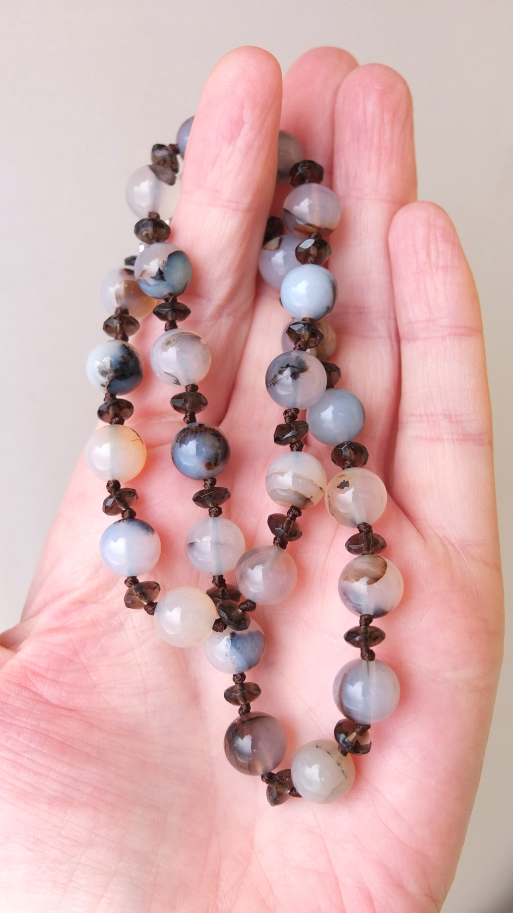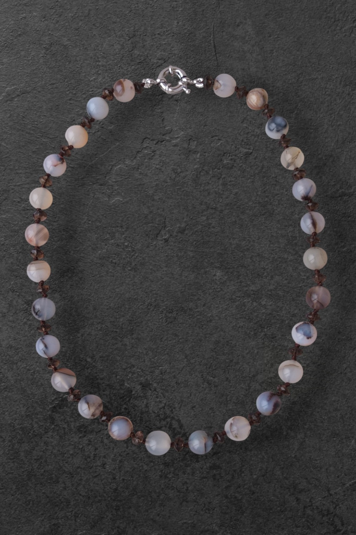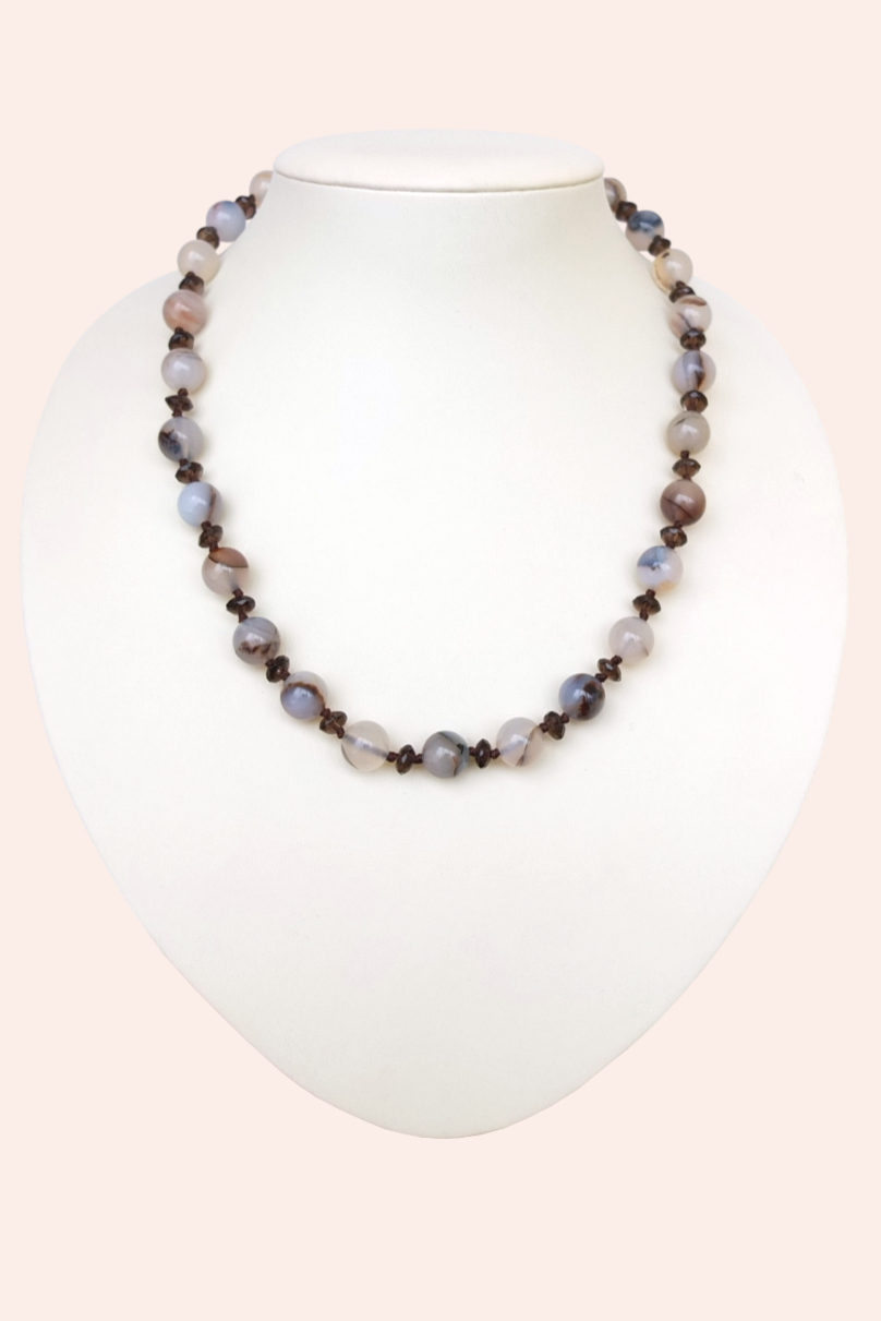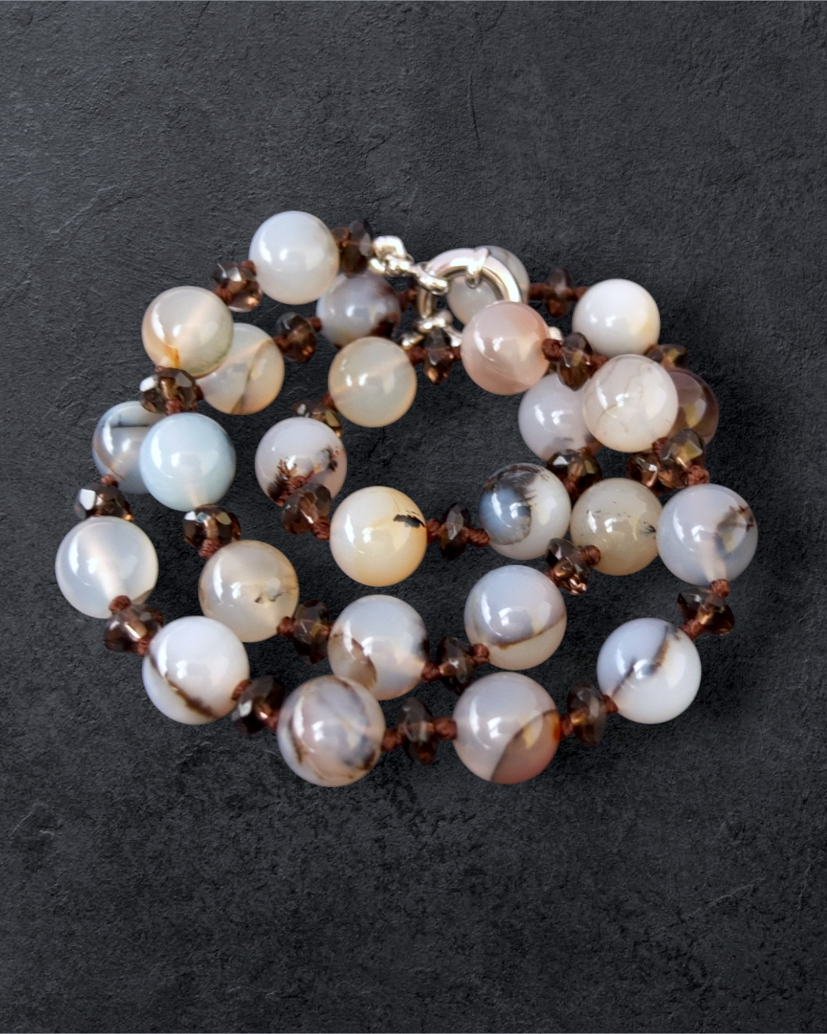 Огранённые бусины раухтопаза добавляют искру и динамику. Они ловят свет, переливаются и создают изысканный контраст с полупрозрачной глубиной агата.