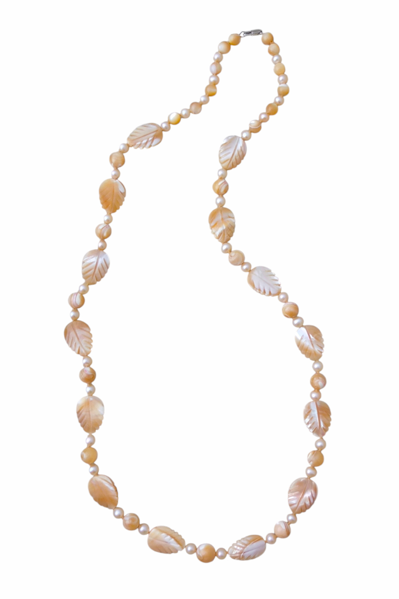 Миленькие удлинённые бусы из бежевого перламутра и пресноводного жемчуга как нельзя лучше подойдут тем, кто предпочитает удобную и комфортную одежду в стиле бохо. Резные листочки перламутра намекают о единстве с природой.