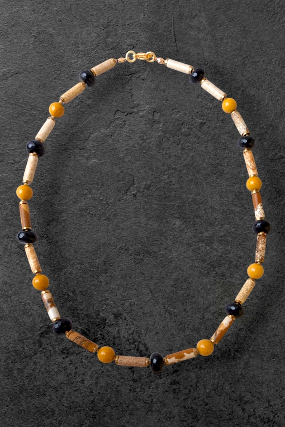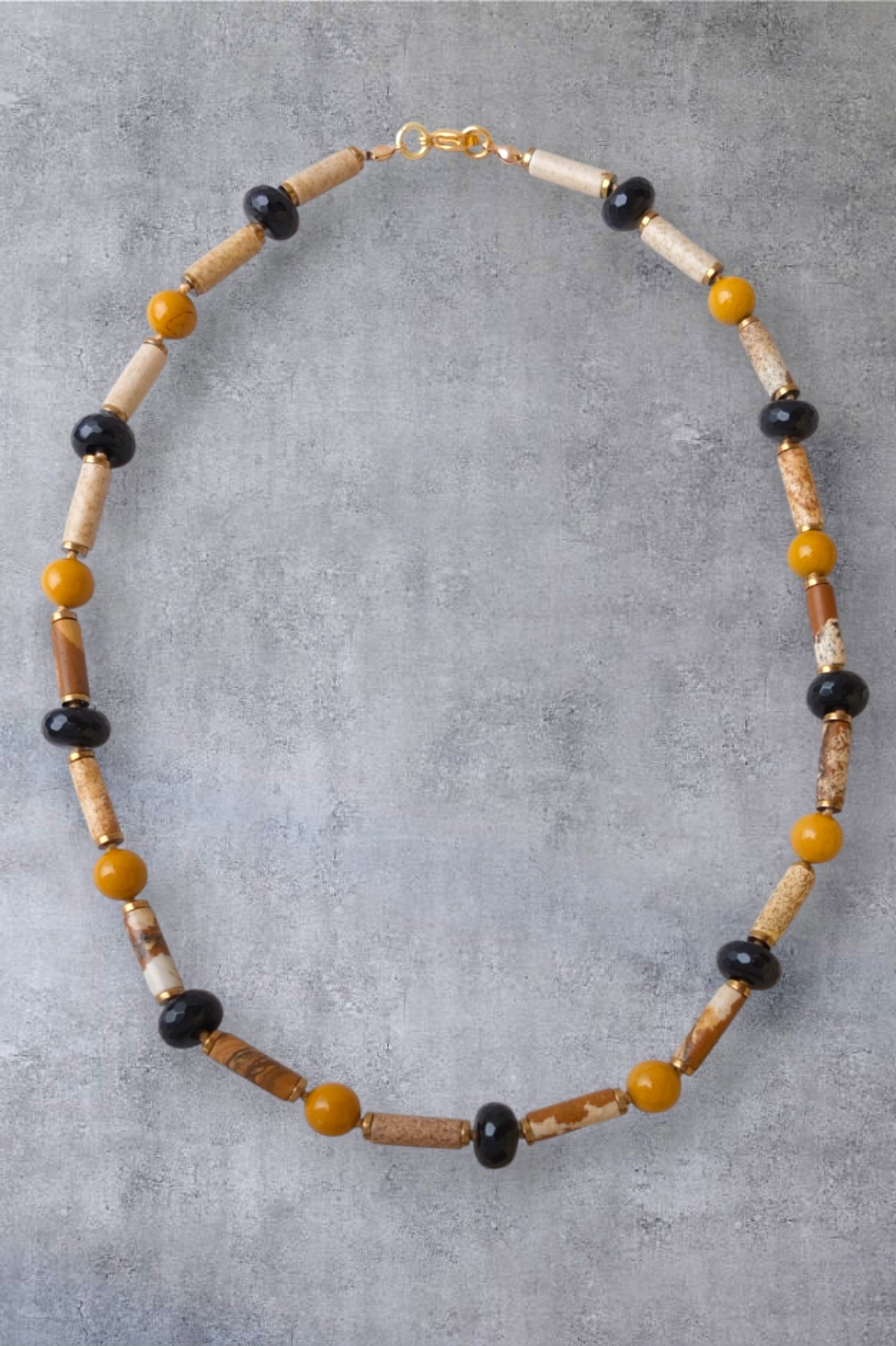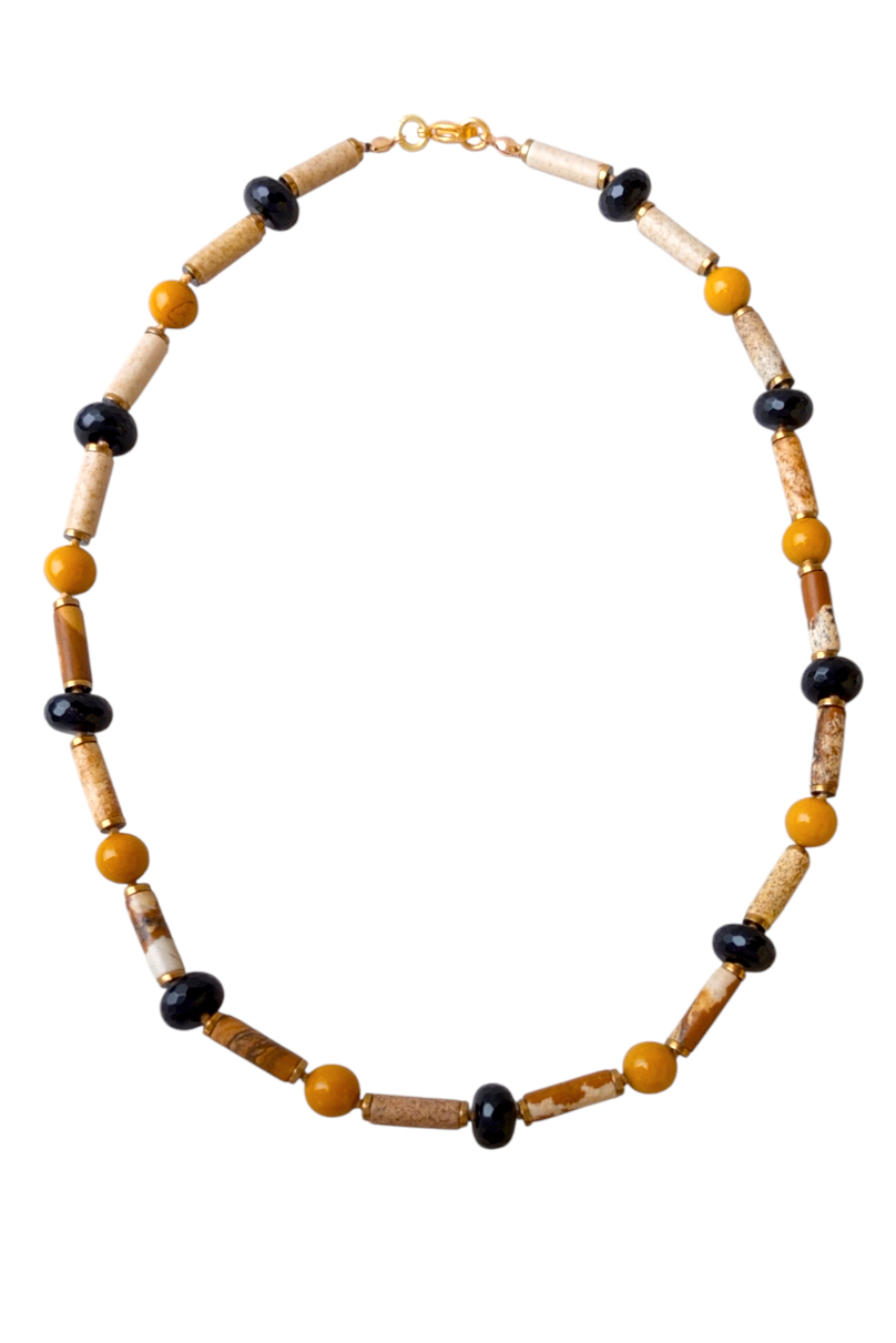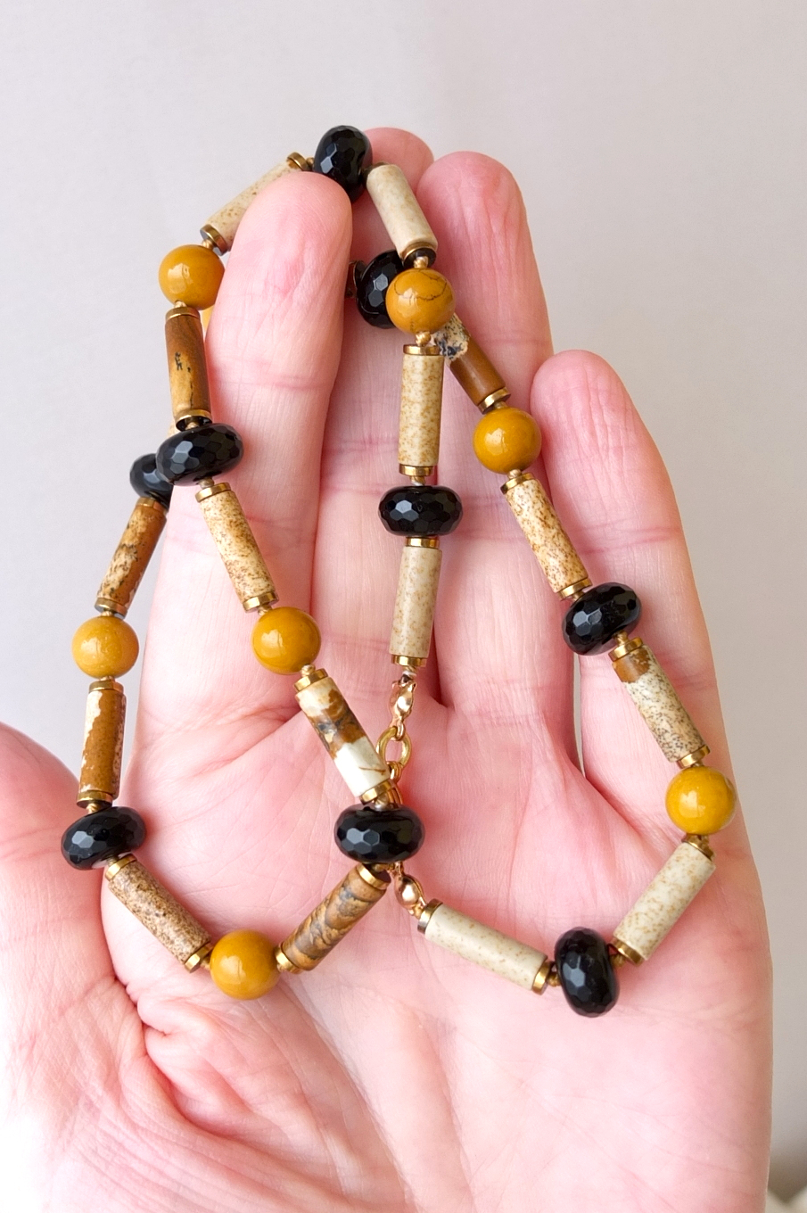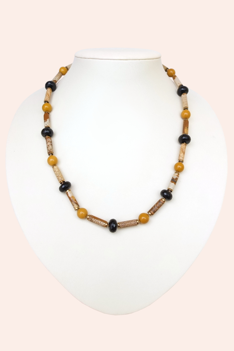 Данные бусы можно отнести к базовым украшениям, так как основной и добавочный цвет - бежевый и черный, а горчичный и позолота дарит украшению теплоту, уютность.