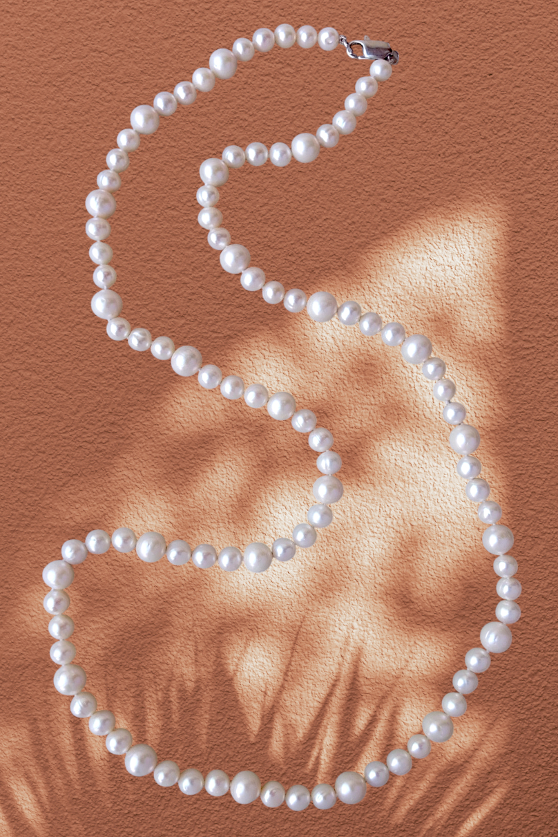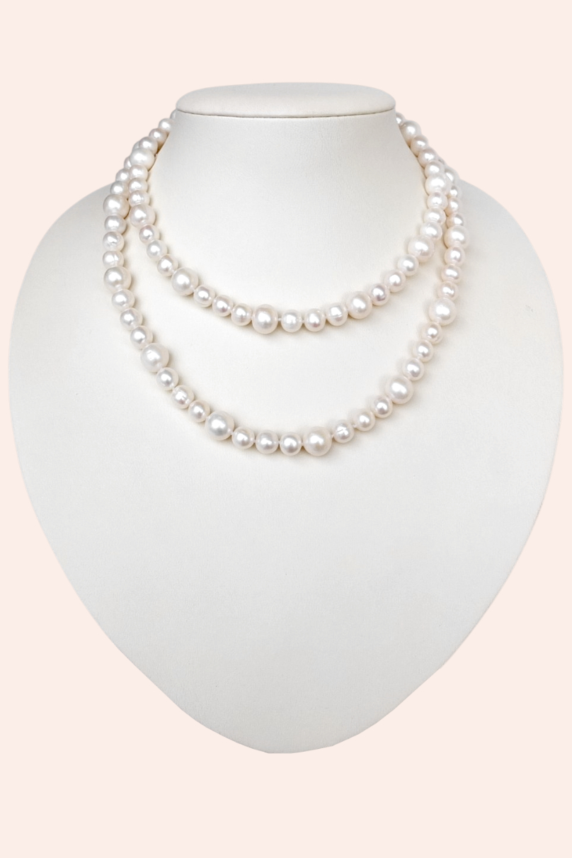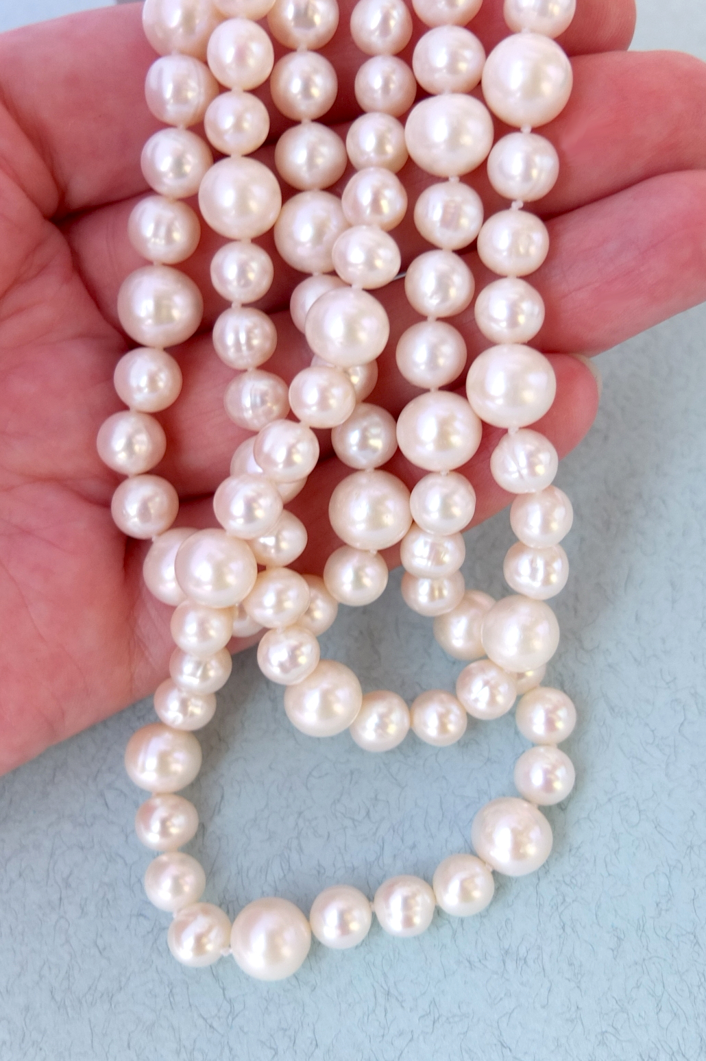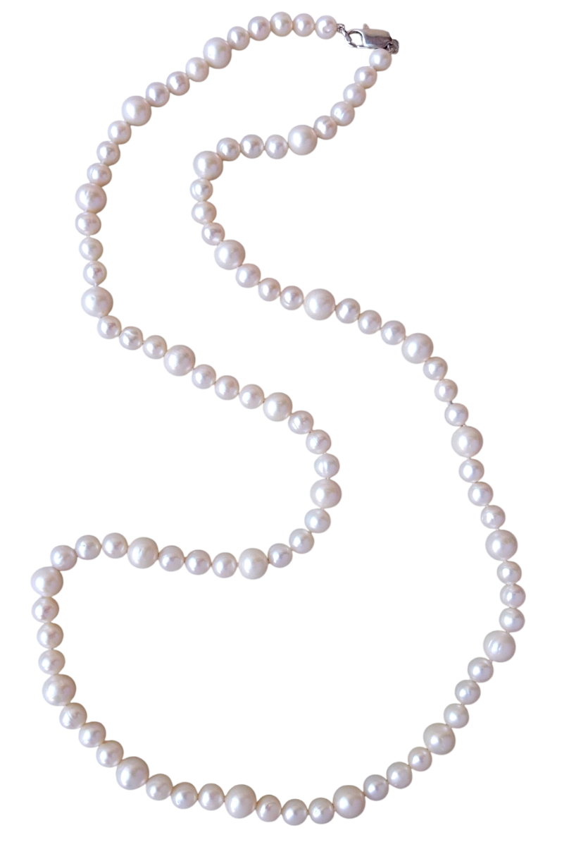Удлинённые бусы из белого пресноводного жемчуга. Мелкие жемчужины чередуются с крупными. Такой приём чередования жемчужин создаёт иллюзию расширения - бусы кажутся в общем массивнее, хотя маленьких жемчужин больше.