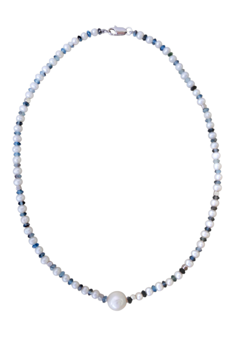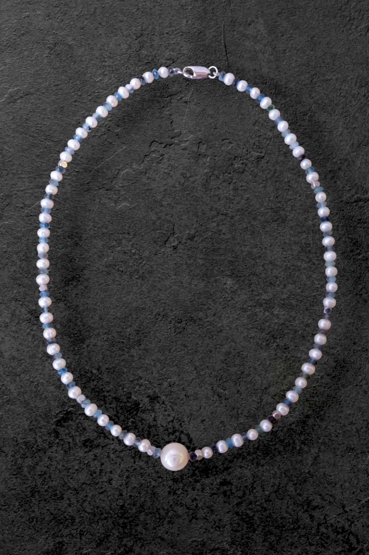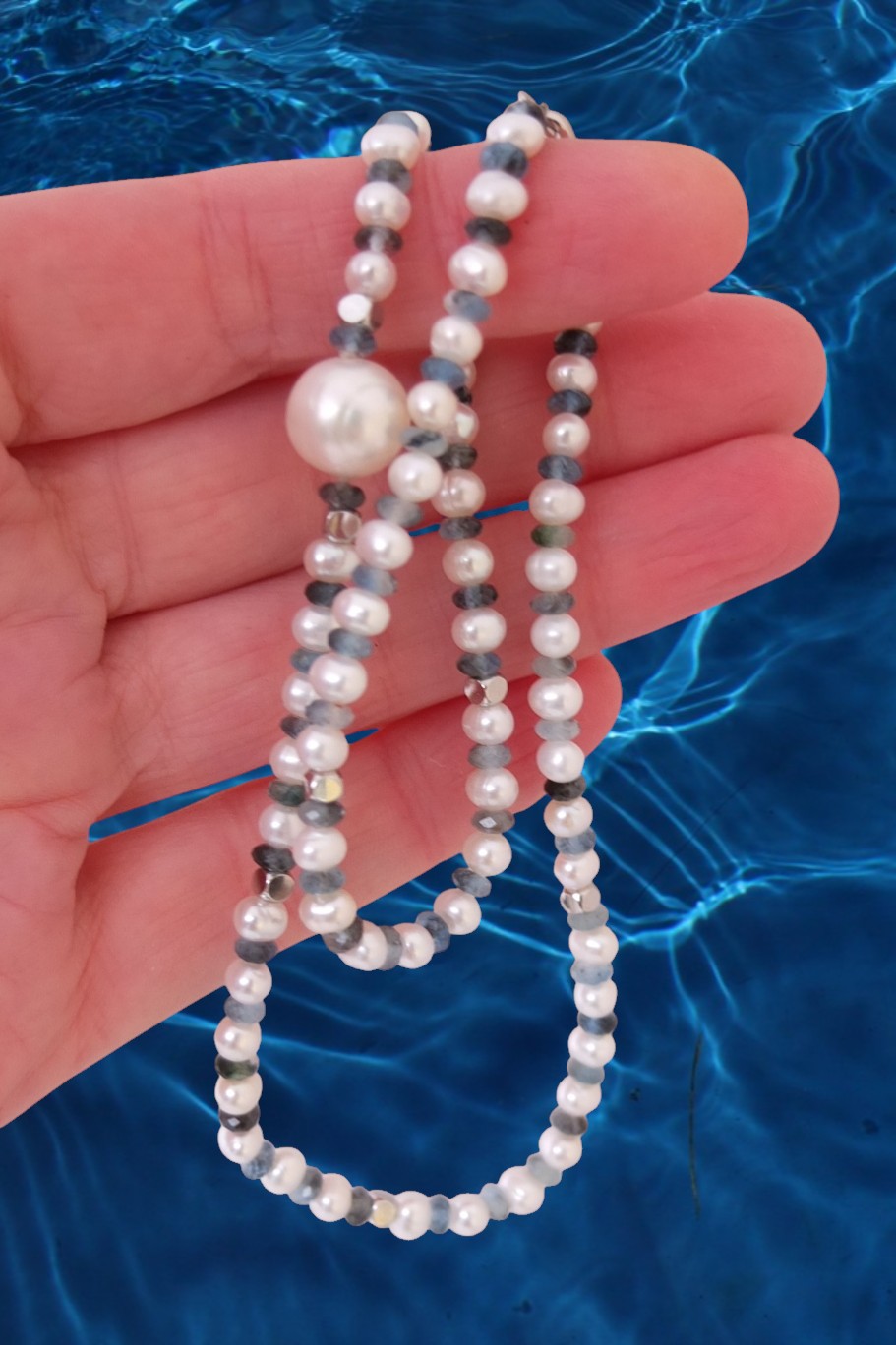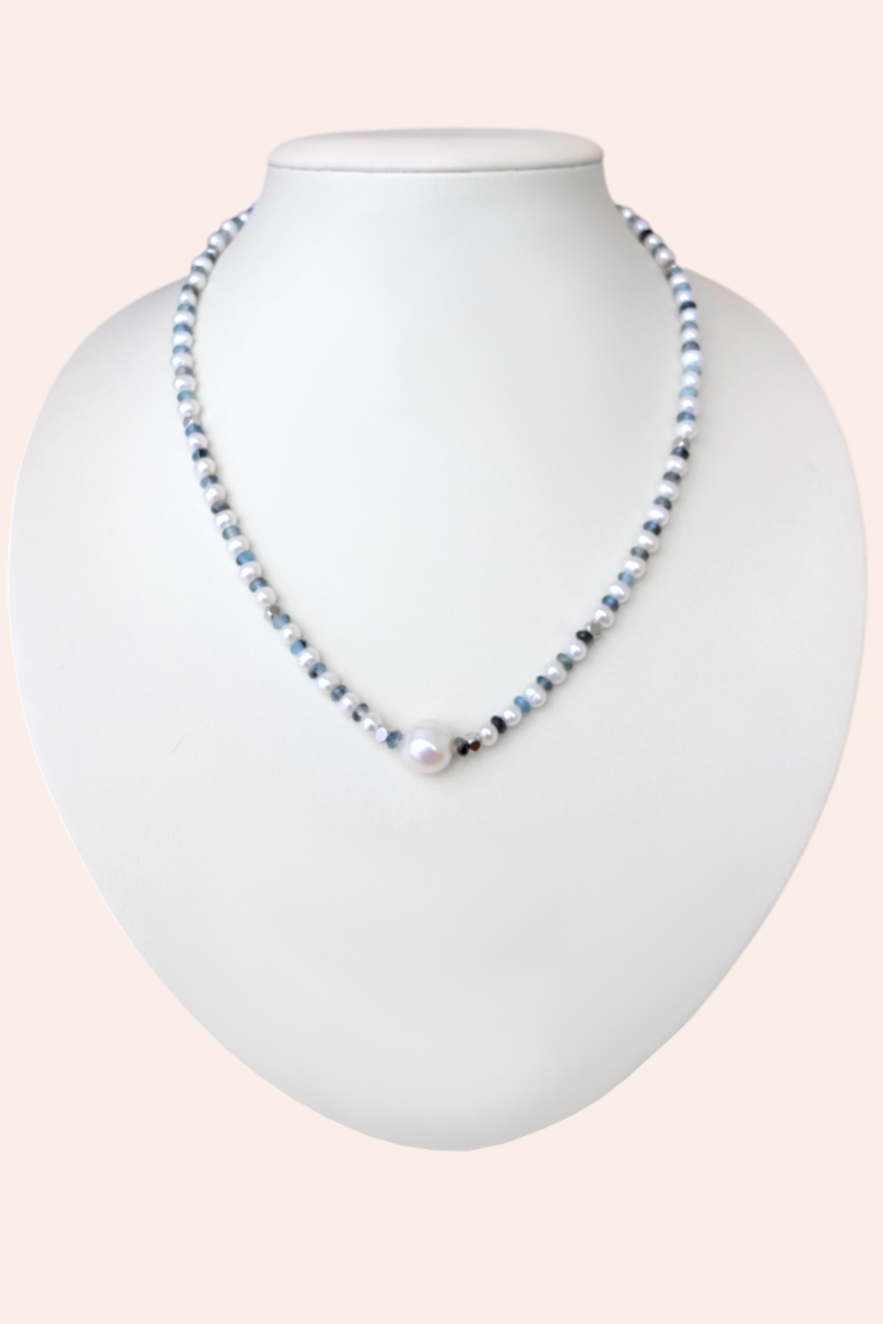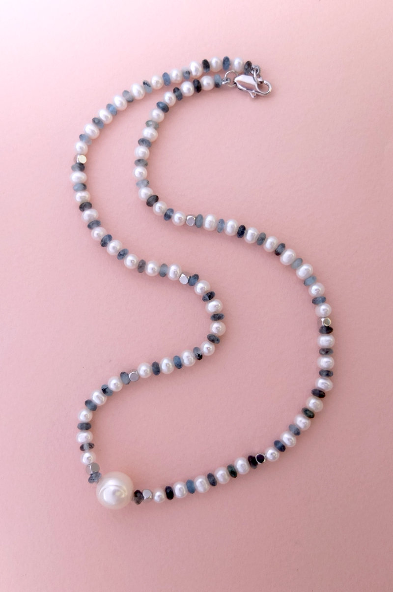 Тонкое ожерелье под шейку из мелкого белого жемчуга и центральной крупной жемчужиной диаметром примерно 10,5 мм. Пресноводные жемчужинки чередуются с гранёными бусинами аквамарина 4 мм. Аквамарин с включениями чёрного турмалина (шерла). Вставки в виде кубиков из полированной стали.