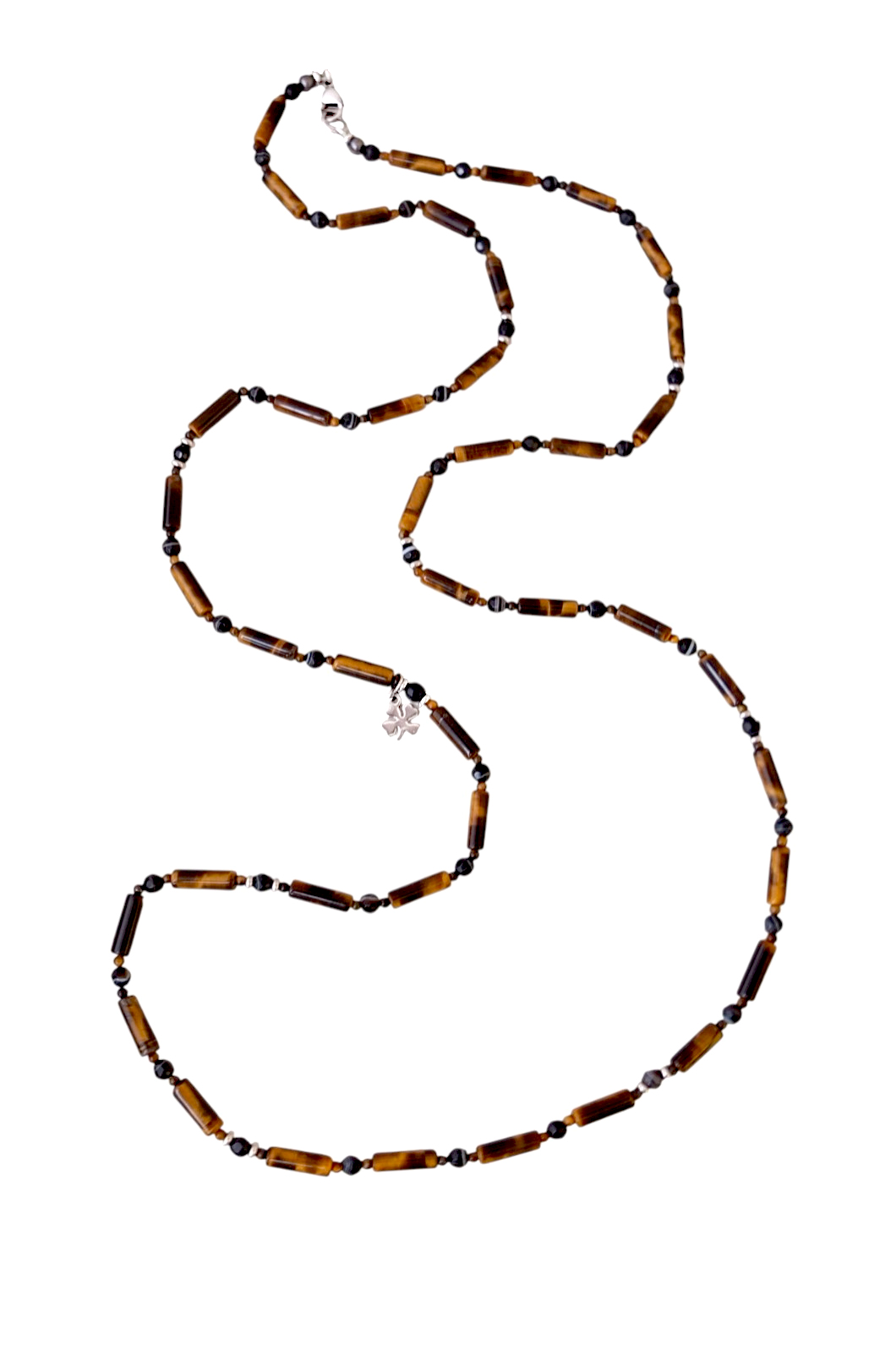 Длинные тонкие бусы из натуральных камней тёмных природных оттенков - отличное украшение для повседневных образов. Специальная ювелирная нить обеспечивает пластичность готового украшения. Вставки из нержавеющей стали создают лаконичные акценты по всей длине бус. Бусы из тигрового глаза и агата - это элегантное украшение, которое может достойно пополнить вашу коллекцию.