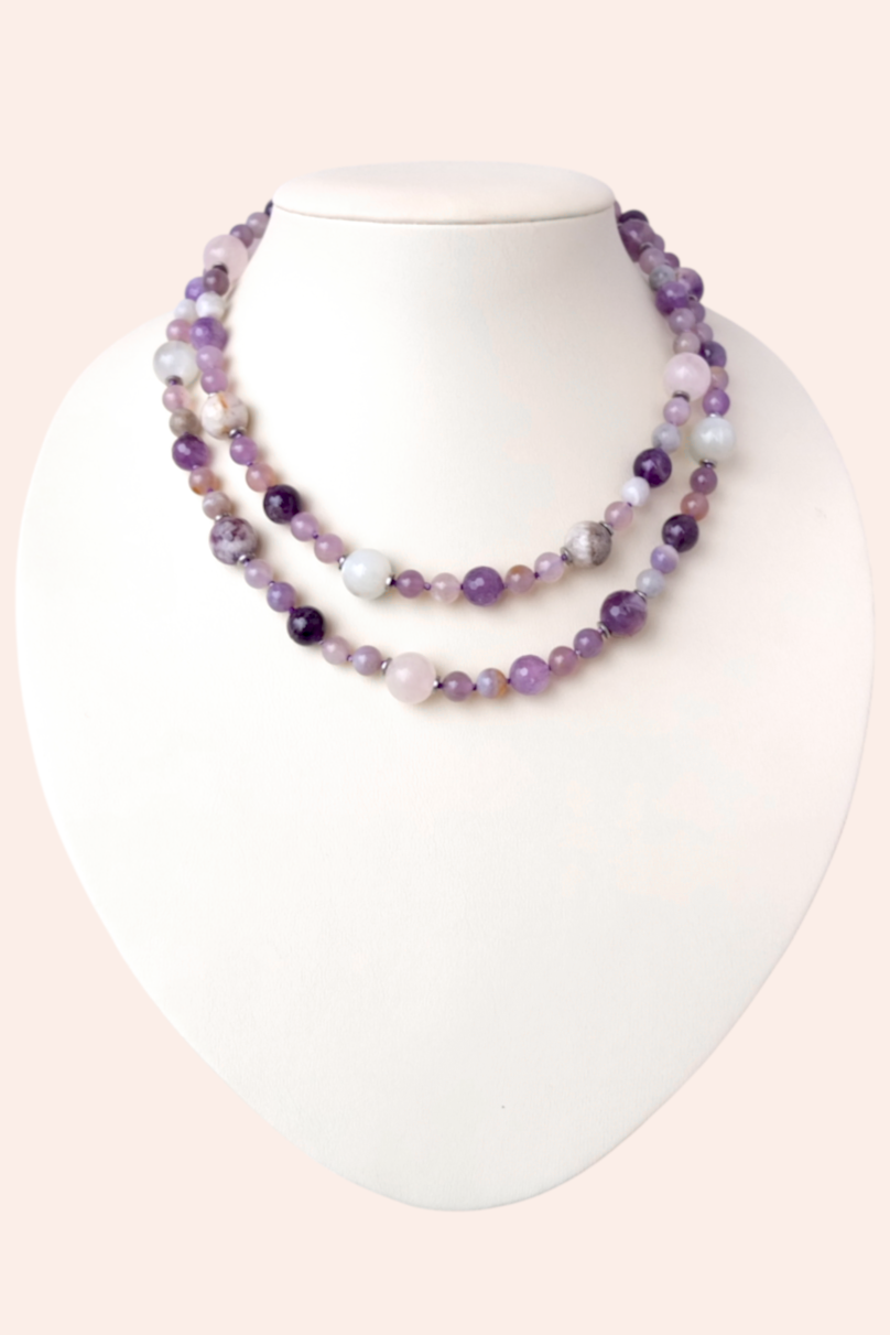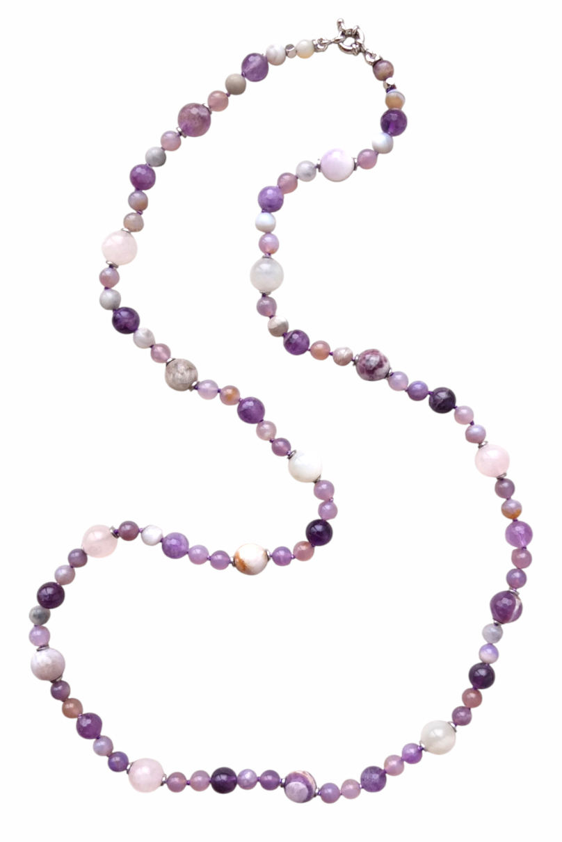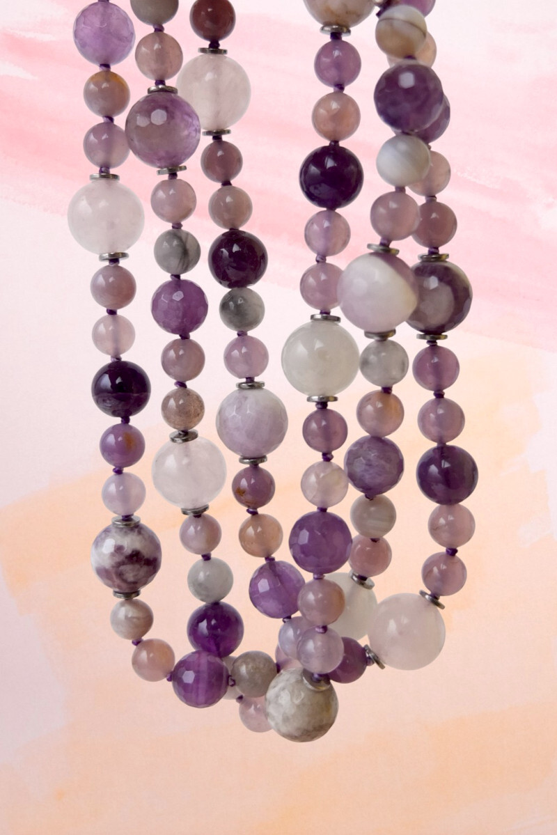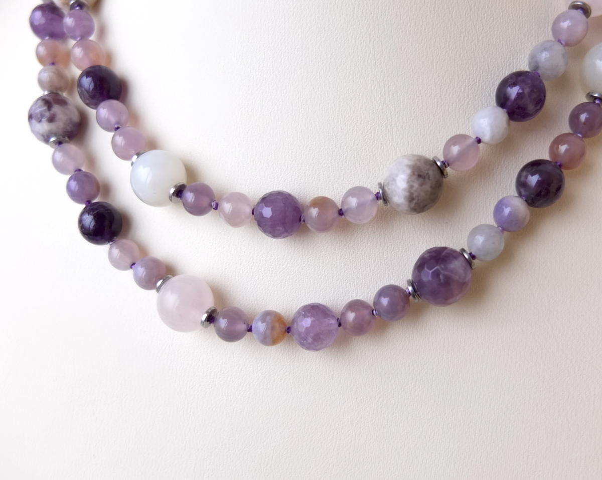 Бусы длиной 77 см в спокойной сиреневой гамме. Собраны из натуральных камней: аметиста, в том числе с присутствием материнской породы, сиреневого флюорита, розового кварца, лунного камня, может присутствовать в незначительном количестве светлый агат. Украшение дополнено вставками из металла, которые создают дополнительный блеск и подчёркивают его архитектуру.