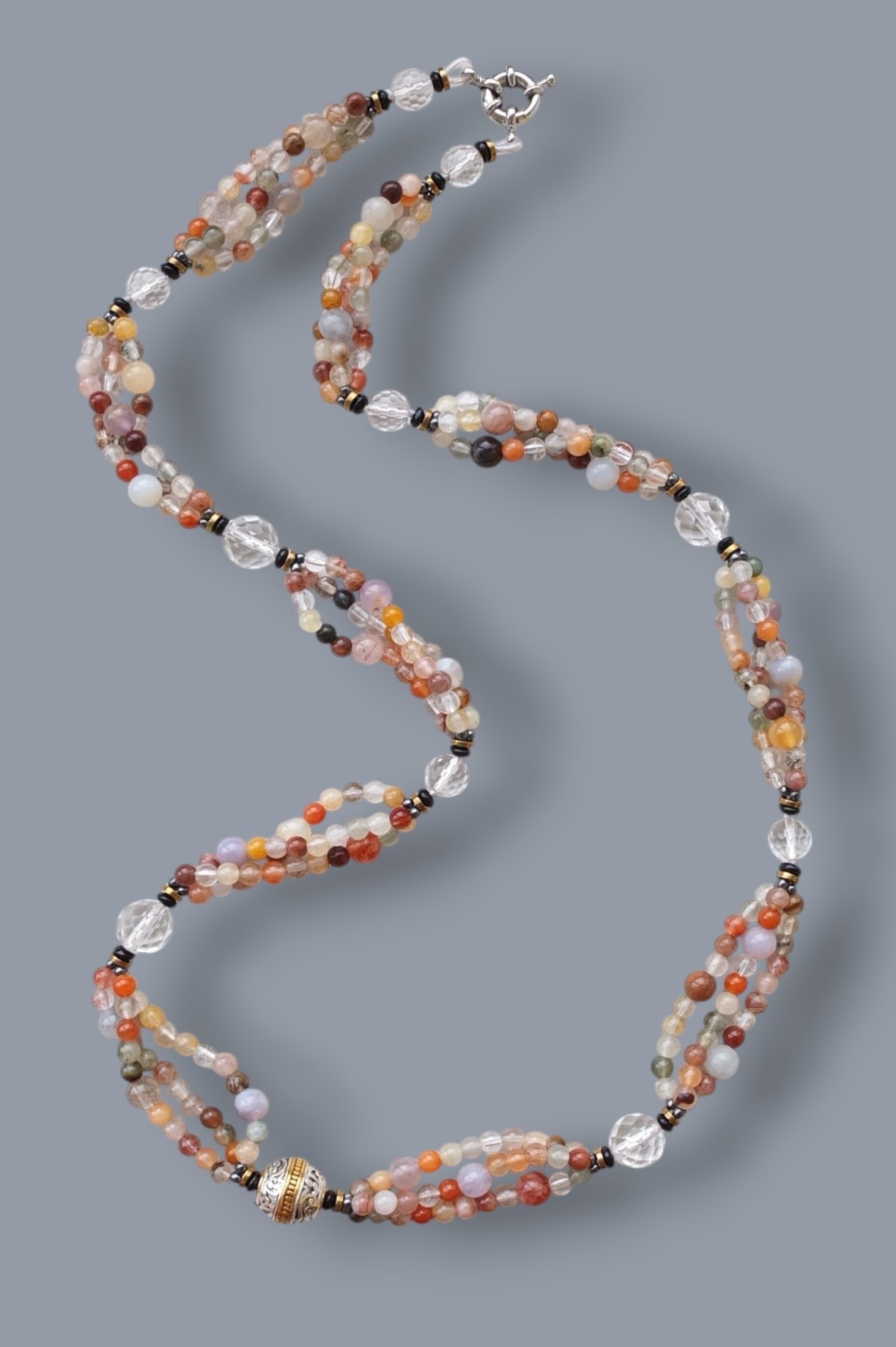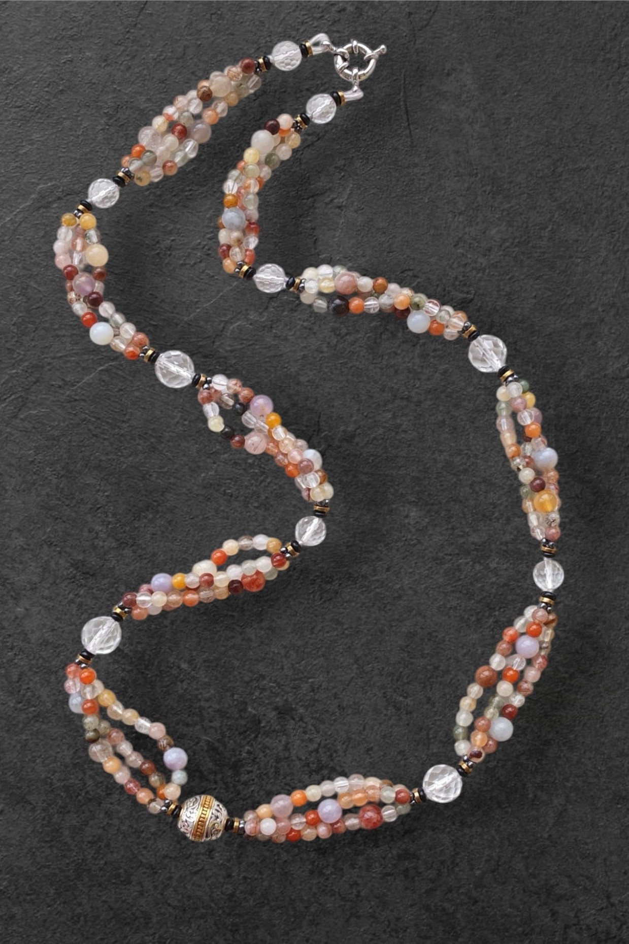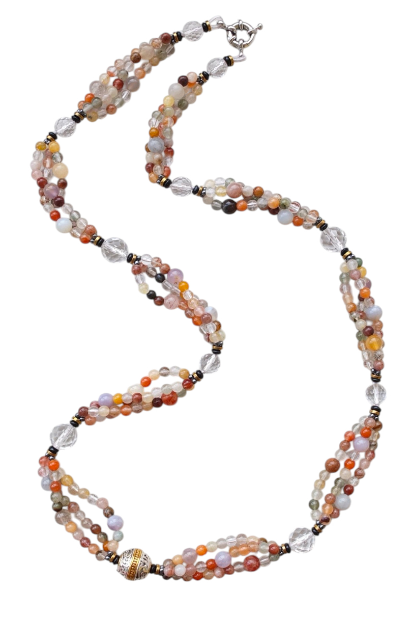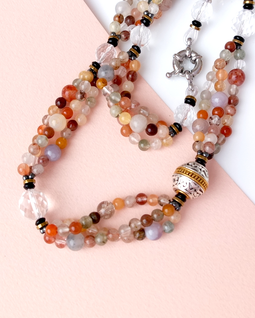 Авторское ожерелье из разнообразного кварца с небольшим включением флюорита, декоративная бусина в центре задаёт слегка античное настроение.