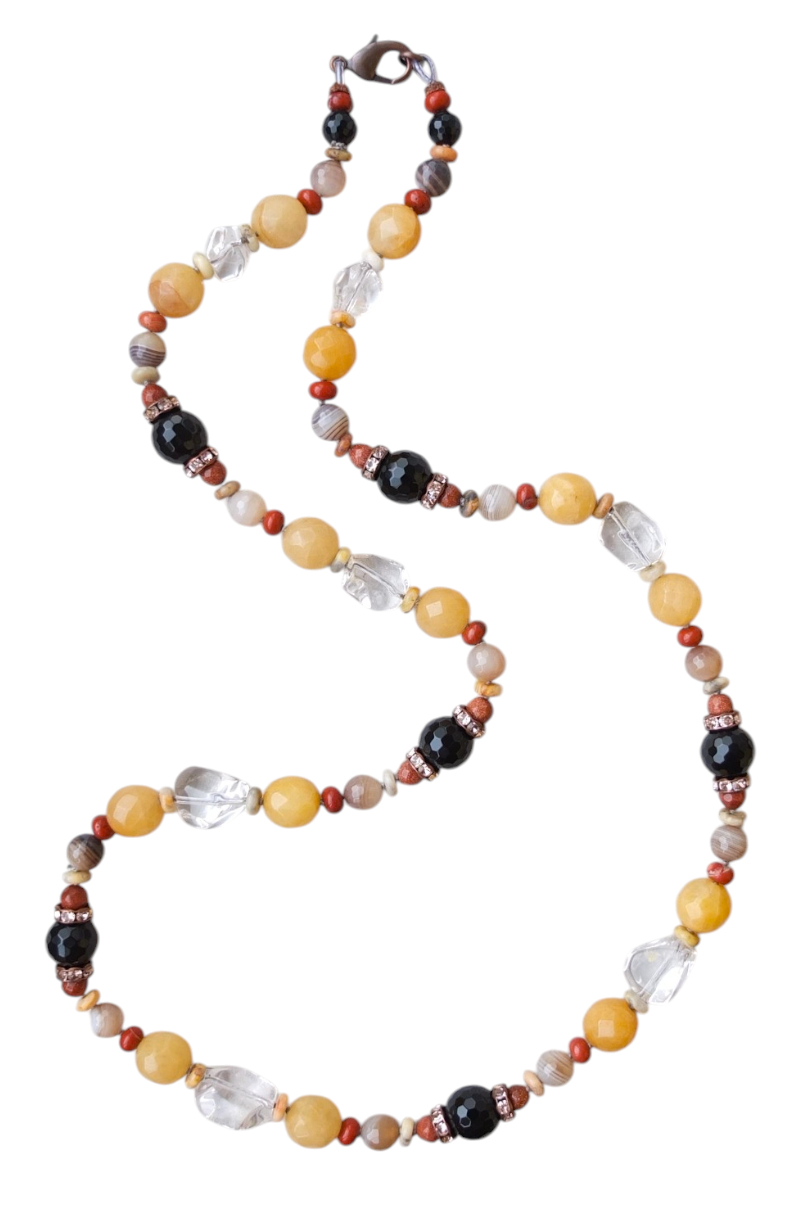 Бусы "Барбара" выполнены в тёплых, золотисто-коричных оттенках. Чёрный агат и прозрачный кварц - основные камни украшения, строгие и притягательные, вокруг них формируется обрамление из камней аппетитных оттенков, напоминающих корицу, капучино, ваниль. Украшение нарядное, крупное, жизнерадостное, подходит для дневных и вечерних образов.