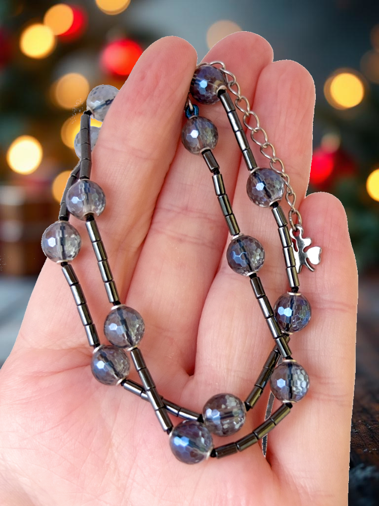 Диаметр бусин 8 мм, между ними трубочки гематина, поддерживающие блеском кварц. Цепочка со спаянными звеньями.