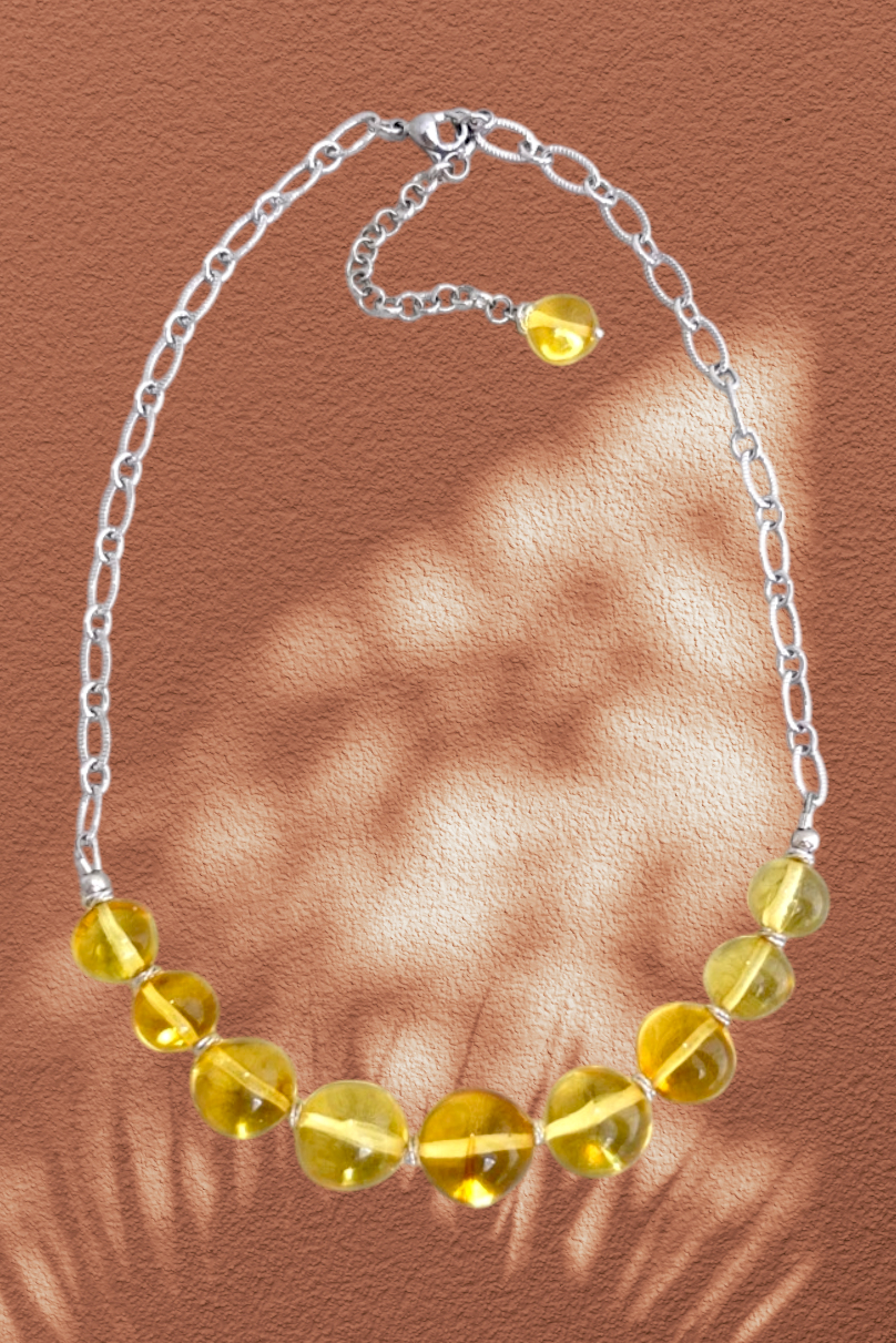 Колье чокер с натуральным цельным янтарём. Бусины формы мятый шар из лимонного прозрачного янтаря диаметром 12-15 мм. Цепочка резная со спаянными звеньями.
