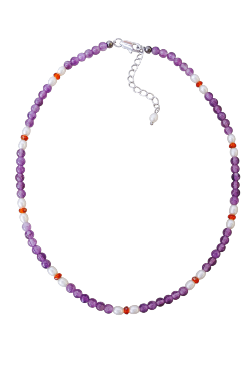 Тонкие бусики из натурального аметиста и пресноводного жемчуга рисообразной формы, диаметр бусин 4,5 мм, вставки из гранёных бусин с имитацией оранжевого граната спессартина (про-во Чехия), цвет граната передан великолепно. Удлиняющая цепочка имеет спаянные звенья, нержавеющая сталь. Украшение собрано на особо прочную ювелирную нить с особенным переплетением нитей. Длина чокера 40-45 см.