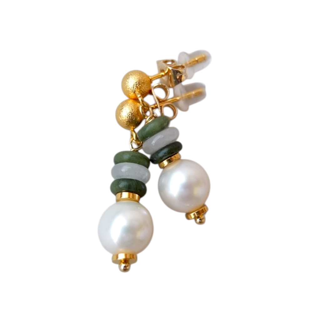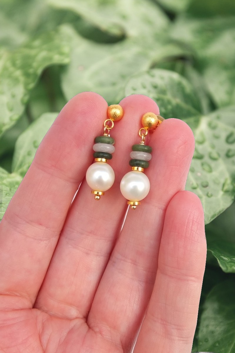 Серёжки типа "гвоздики" с пресноводным жемчугом диаметром 8,5 мм (перламутр жемчуга с очень лёгким изумрудным отливом), канадским нефритом, кальцитом. Гвоздики (сам "гвоздик" и шарик) с премиальным золочением 24 К, очень стойкое покрытие. Общая высота серьги чуть меньше 3 см.