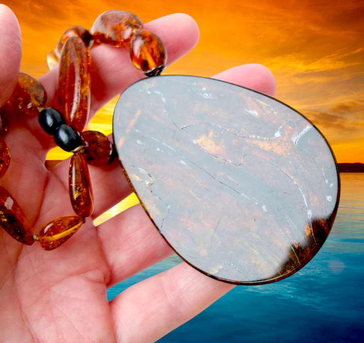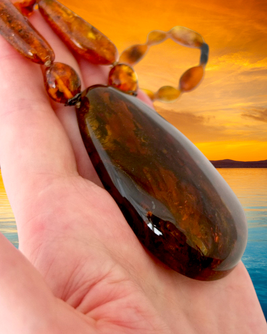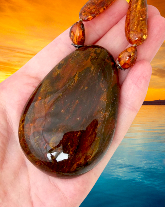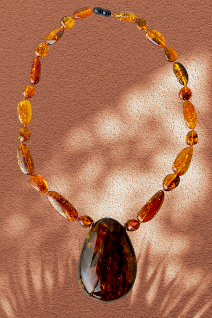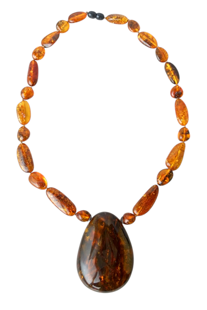 Колье из натурального балтийского янтаря. Длина продолговатых бусин варьирует от 20 до 33 мм, средняя ширина 14 мм. Размер кулона 75*50 мм, толщина около 16 мм. Кулон имеет хорошую шлифовку. На обратной стороне просматриваются линии, похожие на рисунок дерева. Это свидетельство того, что данный кусок янтаря формировался натёками, скорее всего, на коре.