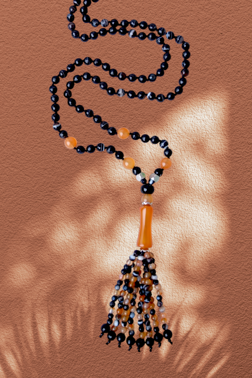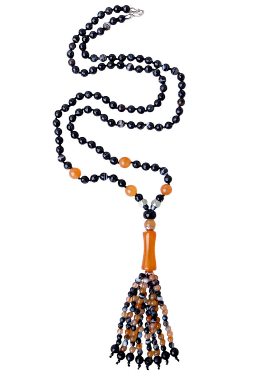 Окружность 77 см. Колье "Альтамира" в оранжево-чёрных оттенках станет красивым дополнением вашей коллекции украшений. В союзе с полупрозрачным сердоликом чёрный агат выглядит ярко и заманчиво.