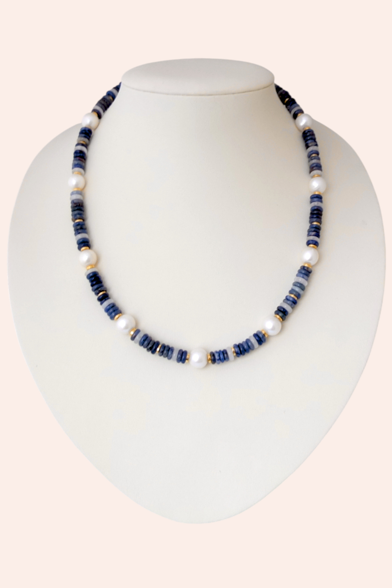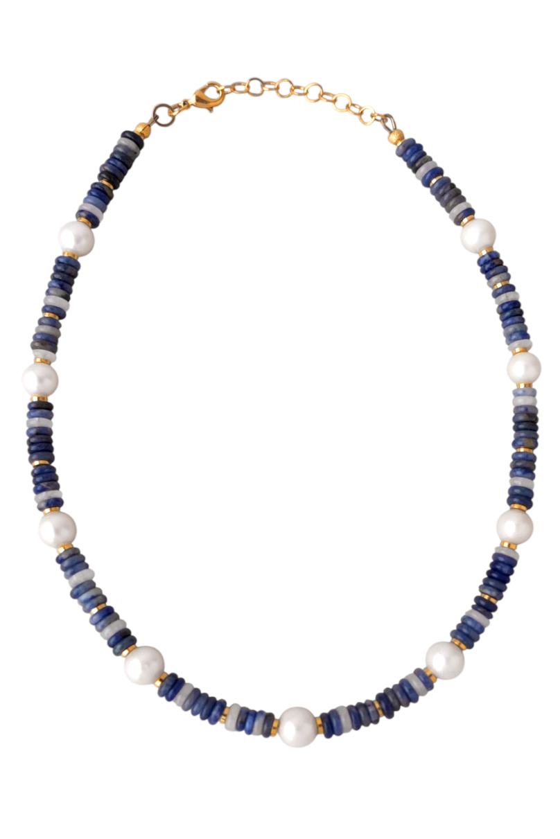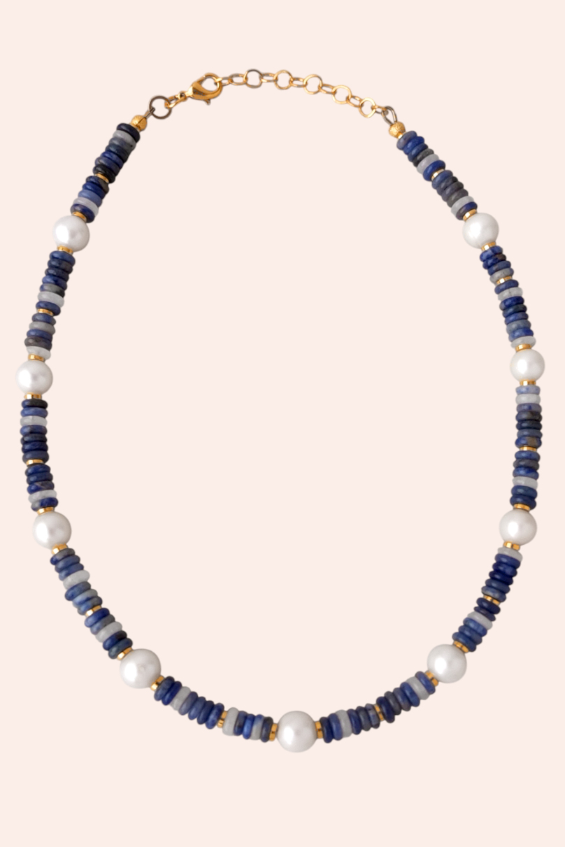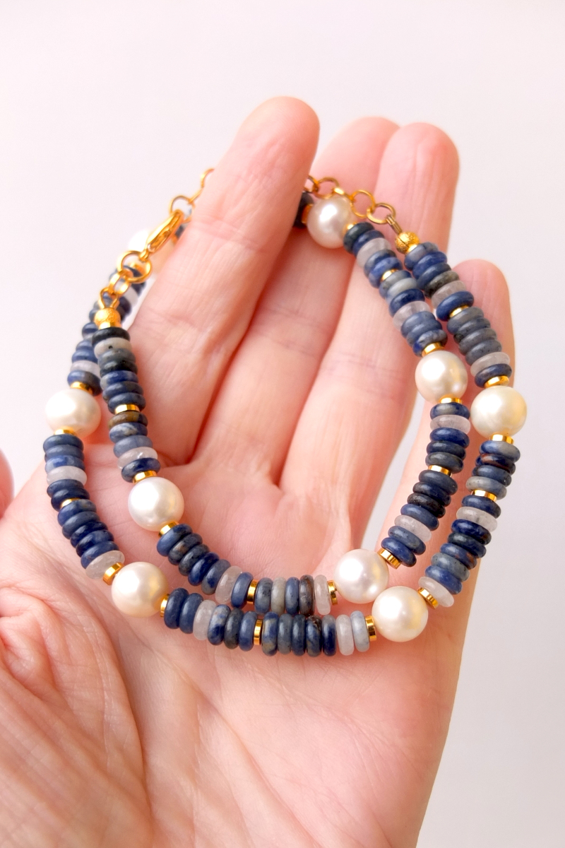 Ожерелье длиной 41-45 см на японском ювелирном тросе. В составе пресноводный белый жемчуг диаметром 8,5-9 мм, содалит, кальцит. Замочек и вставки позолоченные 24К.