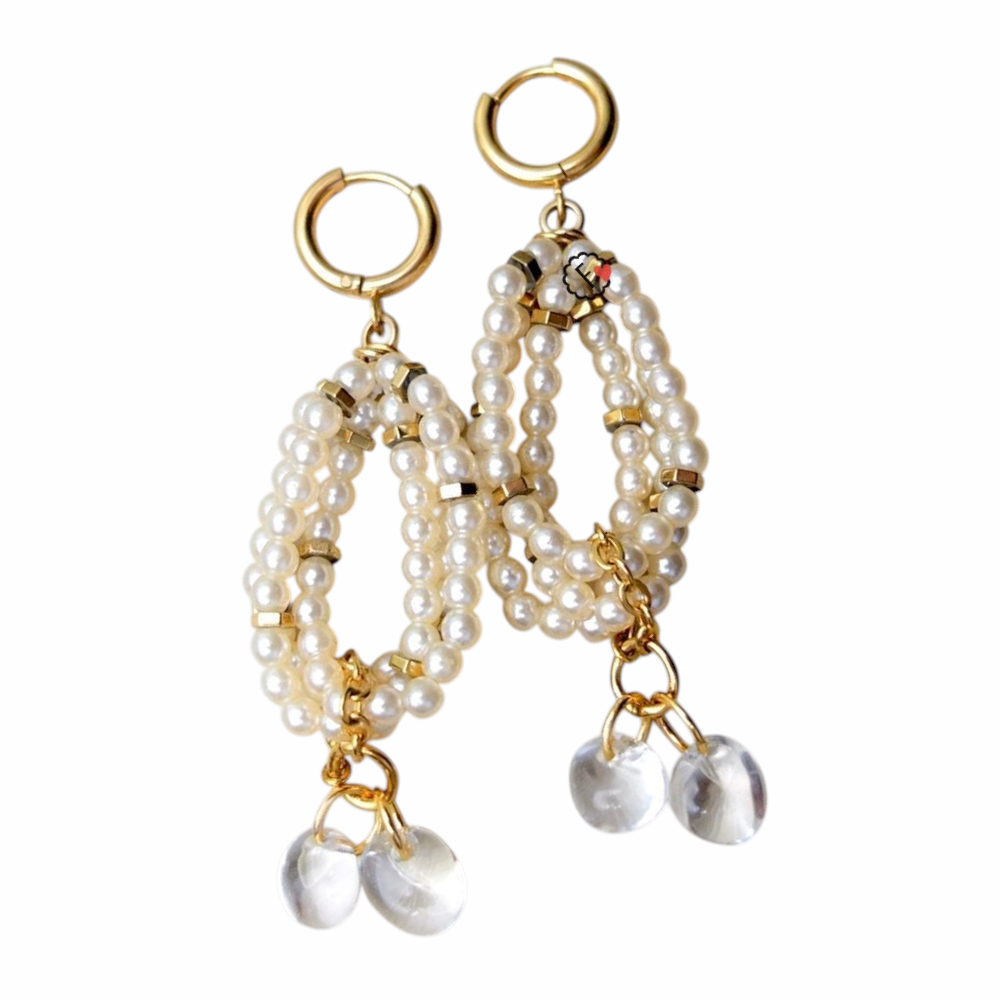 Серьги из чешского искусственного жемчуга диаметром 3 мм, подвески из горного хрусталя. Высота серьги 6,5 см. Фурнитура позолоченная. Салфетка по уходу за украшением в подарок.