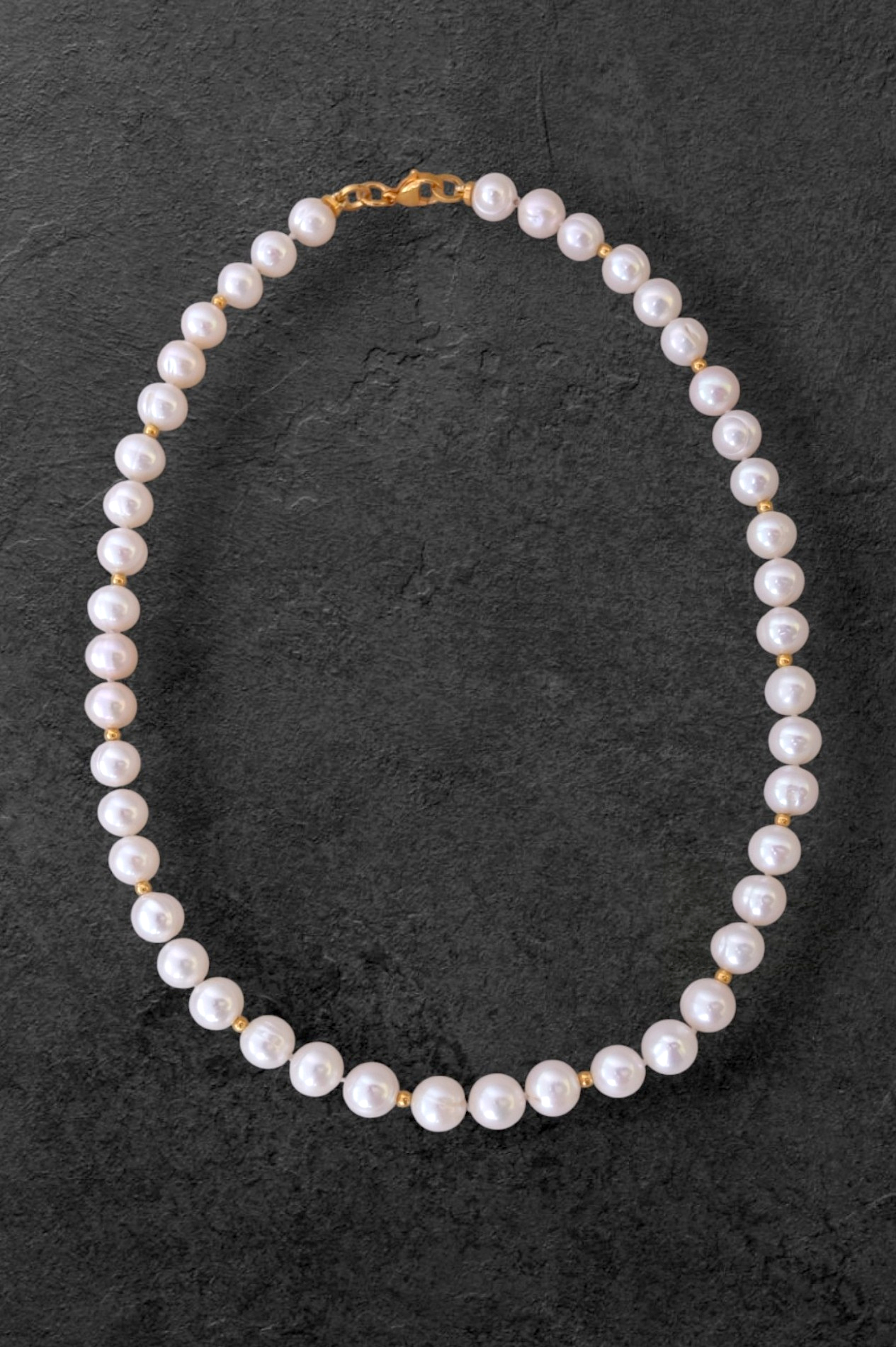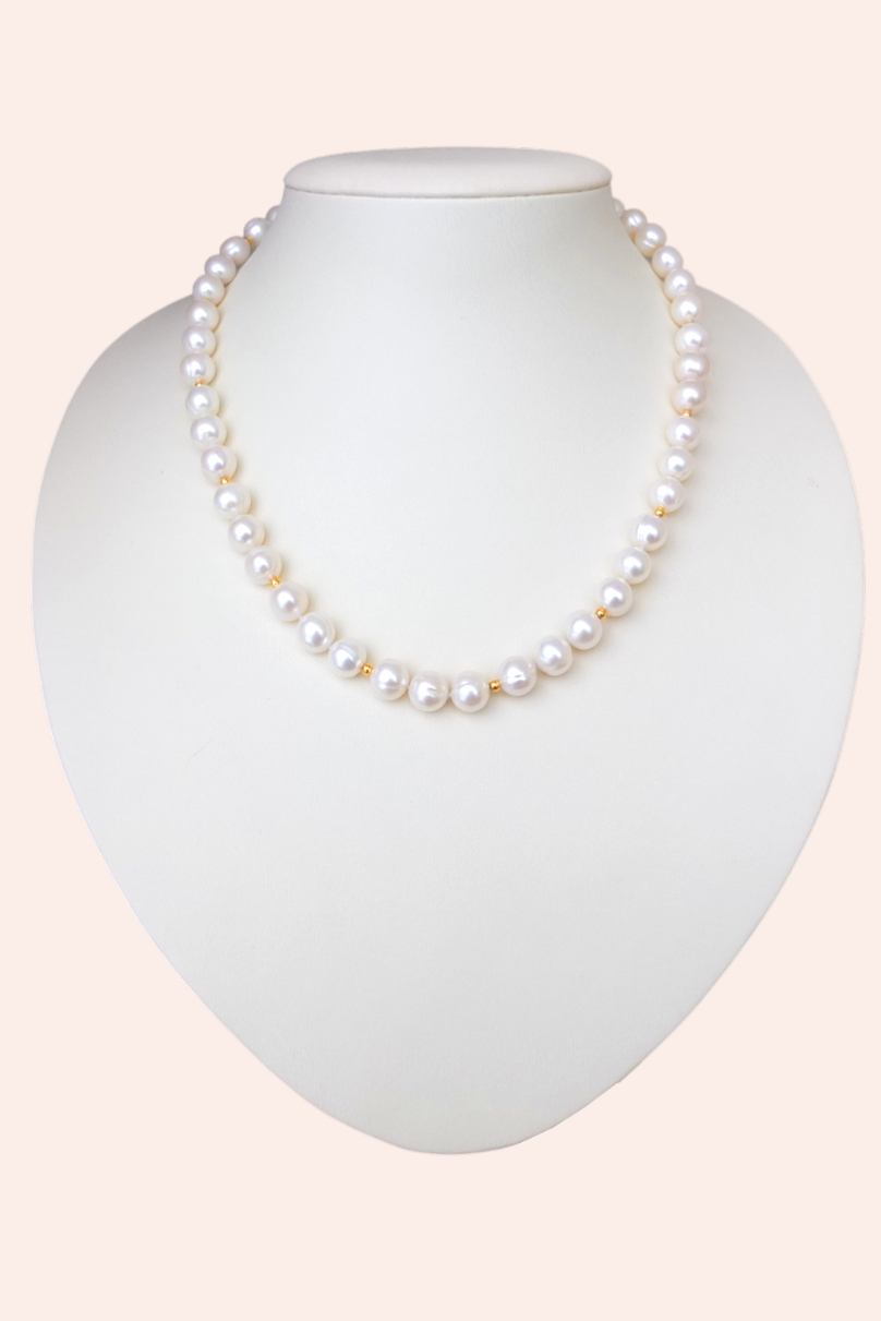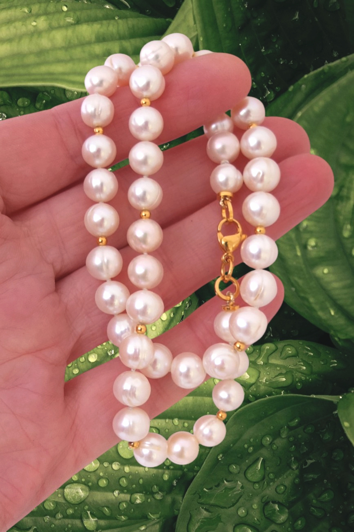Бусы из белого пресноводного жемчуга диаметром 8-8,2 мм. Жемчужины шарообразные, обладают хорошим блеском. Бусы с замочком карабином и позолоченными вставками 24К. Длина нити 42 см.