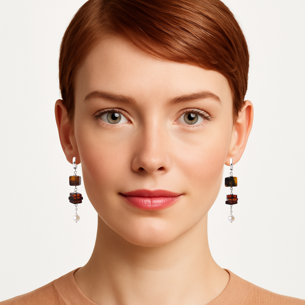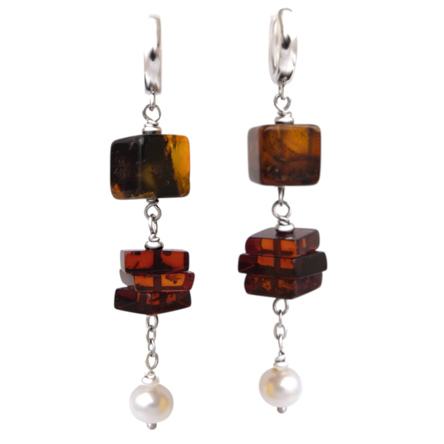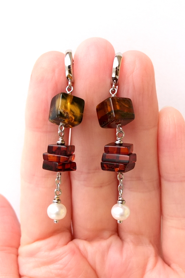 Длинные серьги (общая высота 6 см) с балтийским янтарём и пресноводным жемчугом 6,5 мм.