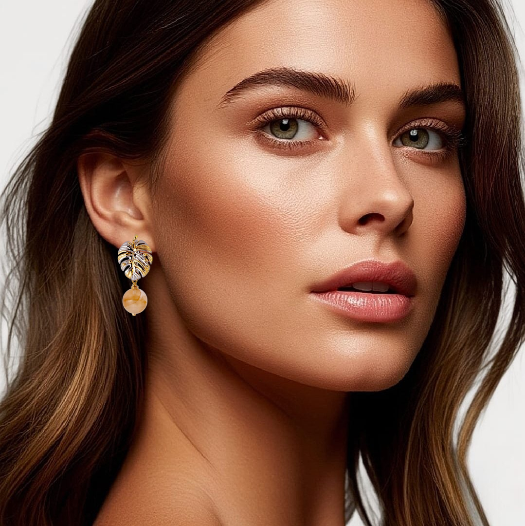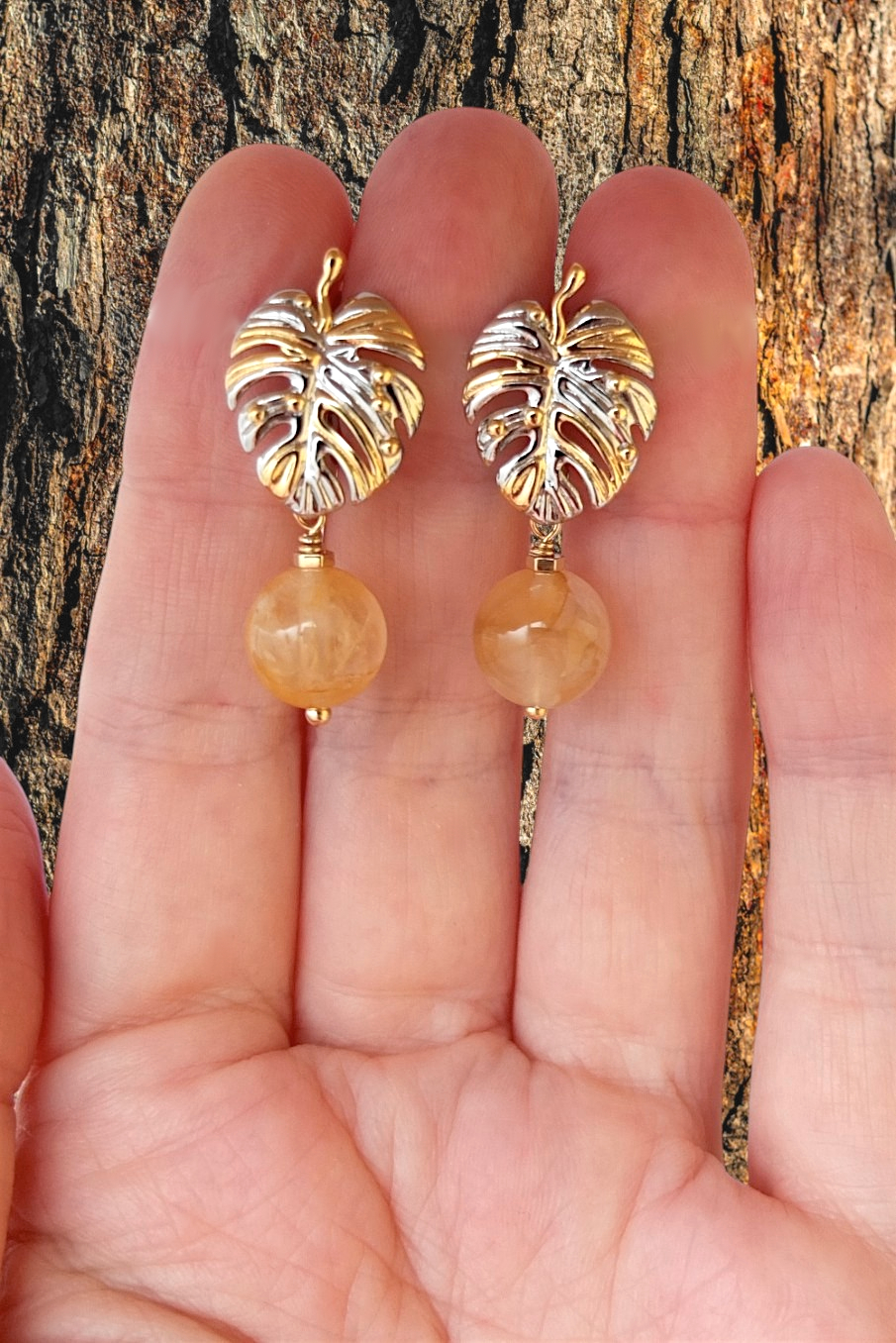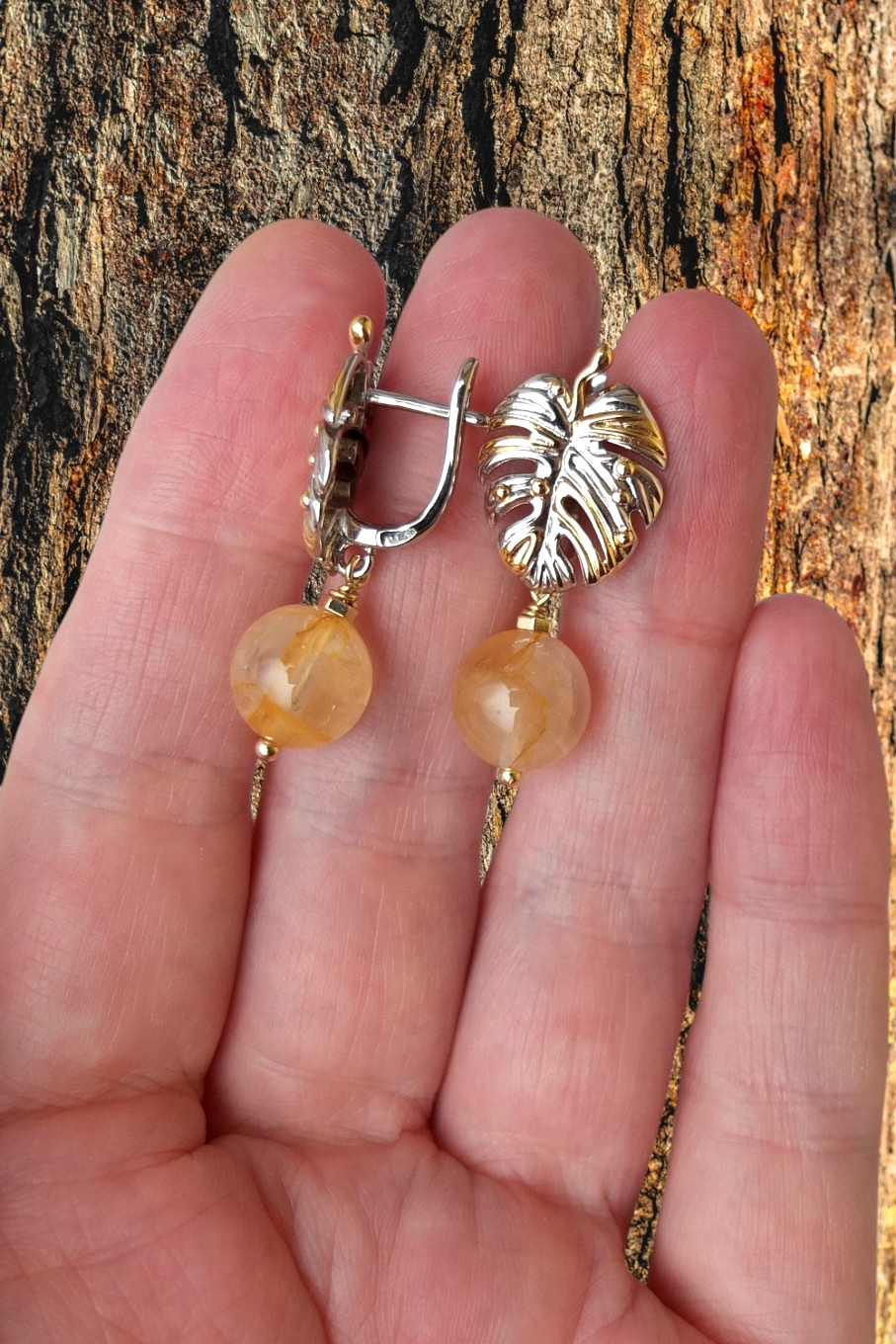 Серьги на английском замке с природным кварцем азезтулит. Роскошные швензы в виде листа с частичной позолотой. Общая высота серьги немногим более 3-х см.