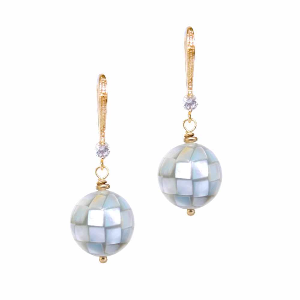 Серьги с натуральным перламутром, мозаичные шарики диаметром 12 мм. Швензы позолоченные, со стразами.