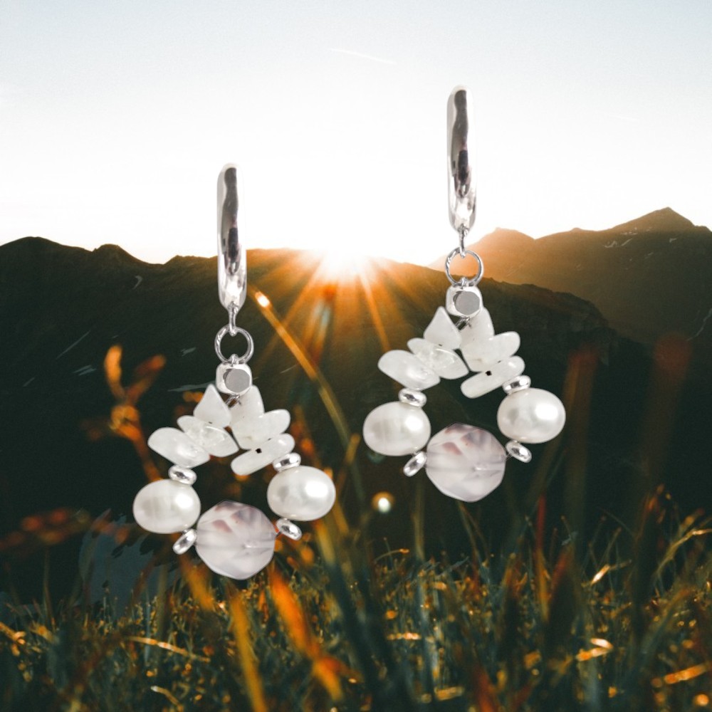 Серьги с натуральным лунным камнем (адуляр), пресноводным жемчугом и агатом природного оттенка. Швензы с английским замком, подвеска из камней в среднем 2*2 см. Полная высота серьги около 4-х см.