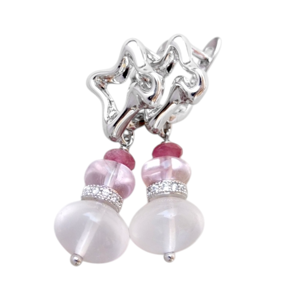 Серьги с натуральными розовыми камнями на фигурных швензах с английским замком. Крупный прозрачно-облачный розовый кварц (11,5*8 мм), розовато-сиреневый флюорит, гранёный рубеллит (иначе, розовый турмалин). Серьги украшены стразами.