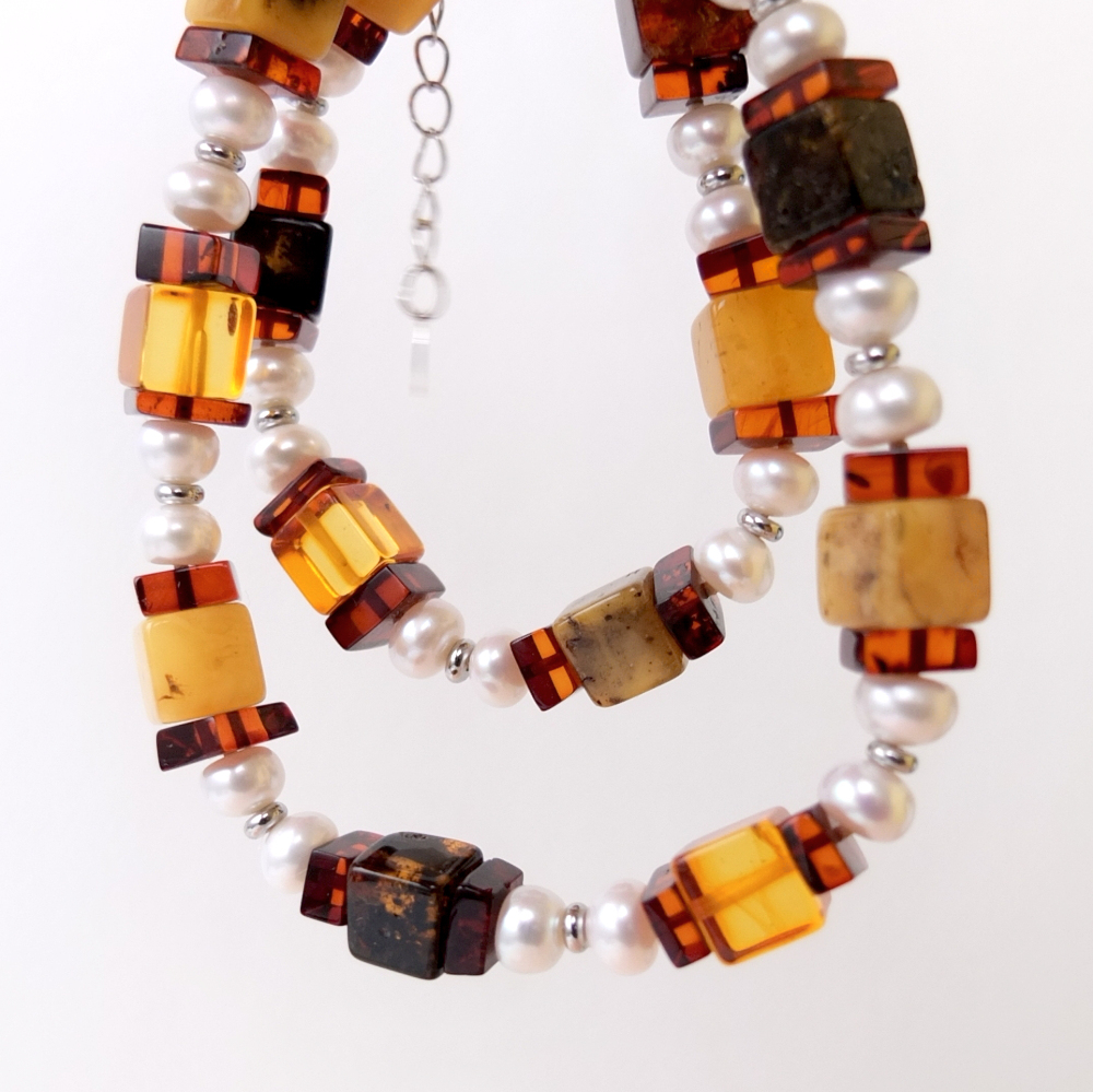 Янтарь разнообразных оттенков: желтый матовый, лимонный прозрачный, зелёных, оливковый, мшистый - и всё это в форме кубиков, которые усиливаются тёмно-коньячными янтарными бусинами-брусочками. Сочетание цветов и формы создаёт ощущение брутальности, смелости, которая неожиданно смягчается шёлковым блеском белого пресноводного жемчуга. Этот контраст рождает идеальный баланс, делая украшение одновременно сильным и утонченным.
