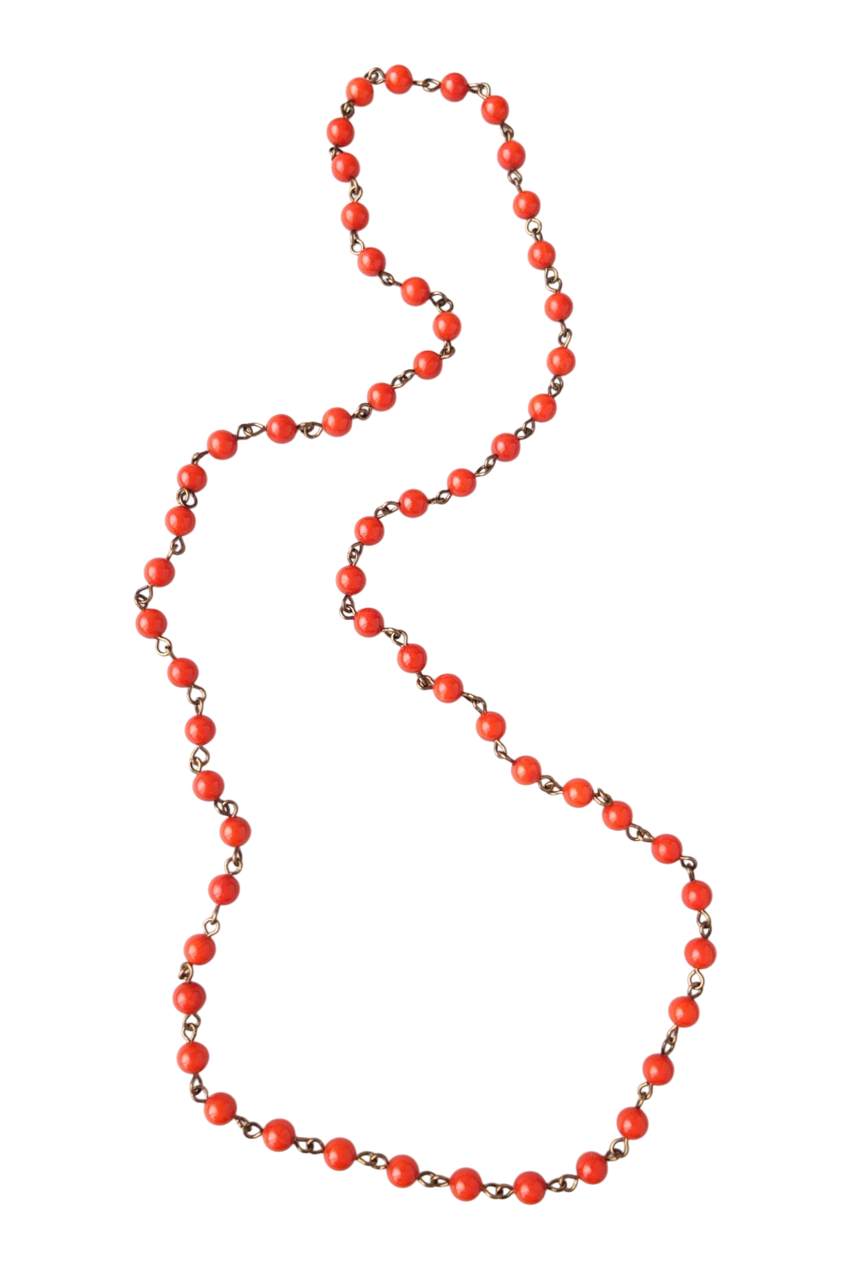 Бусы-цепочка из коралла красно-кирпичного цвета (диаметр около 6 мм, Тайвань), близкого к оттенку средиземноморских кораллов. Украшение без замка, использована американская нетемнеющая проволока цвета античной бронзы. Длина 70 см.